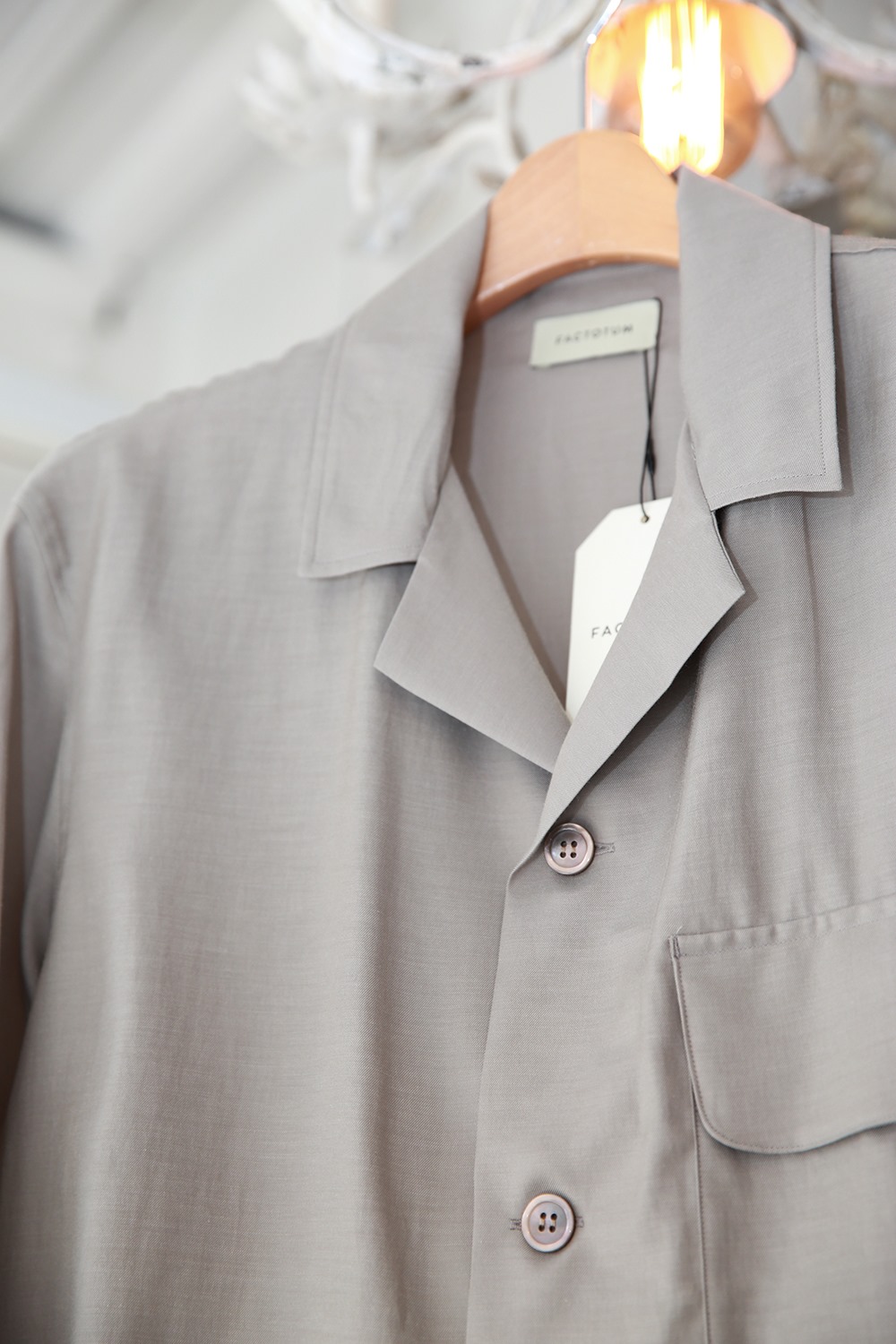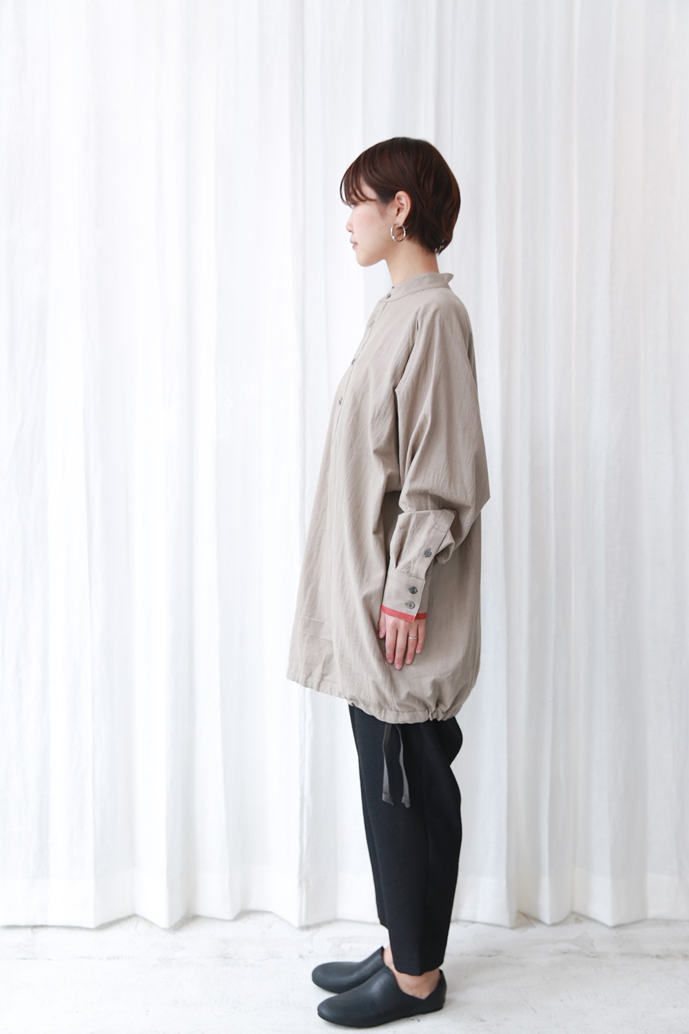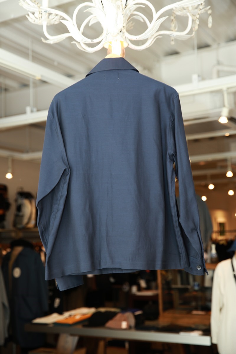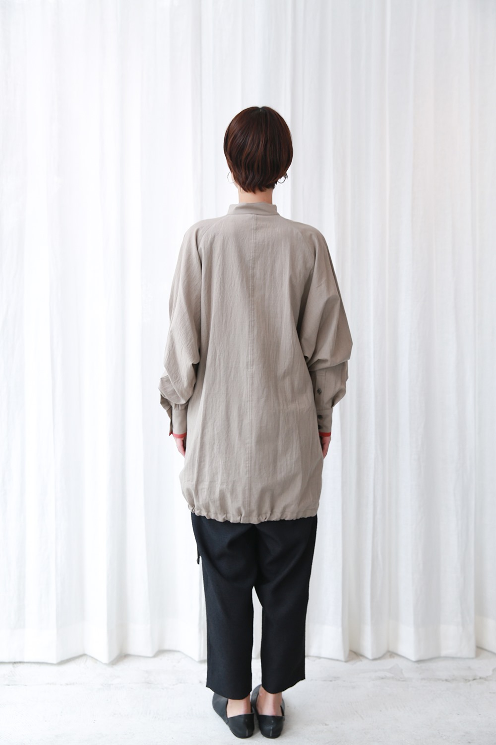 後身頃に特殊な加工を施し優れたキックバック性と美しいドレープ性を持った綿、綿を追撚したジャガードボーダー等を使用し、マテリアルを大胆に切り替え、落ち着いたアイテムにアクティブな表情を演出しています。
