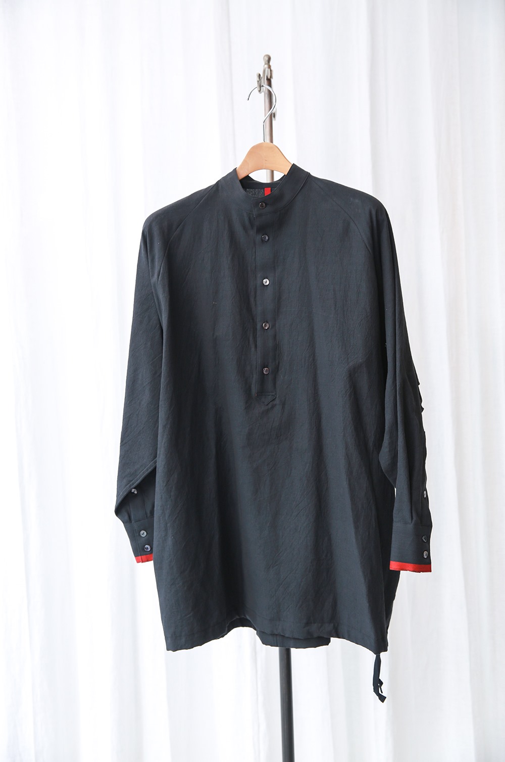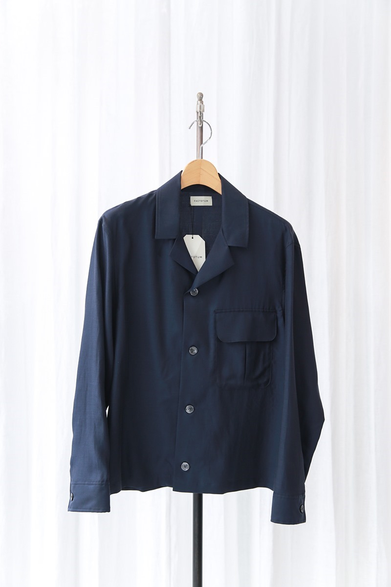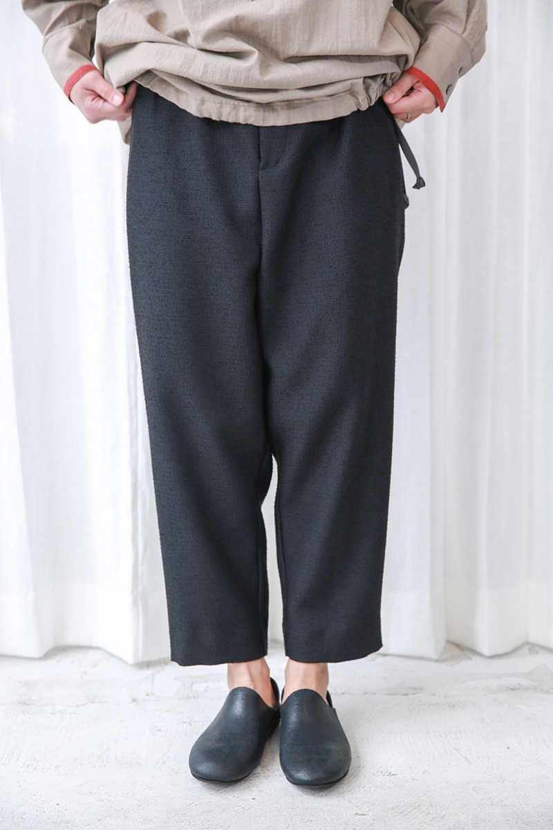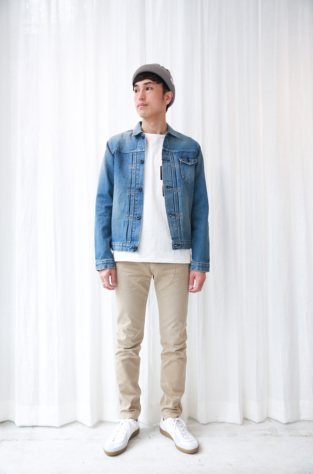 後身頃に特殊な加工を施し優れたキックバック性と美しいドレープ性を持った綿、綿を追撚したジャガードボーダー等を使用し、マテリアルを大胆に切り替え、落ち着いたアイテムにアクティブな表情を演出しています。