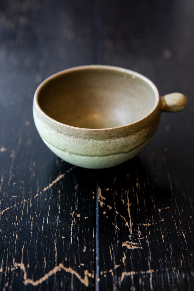 多くの作品を磁器で作られる竹村さん、しかしこちらのスープカップは熱々スープを注がれる事を考えて熱を通しにくい陶器で作られております。