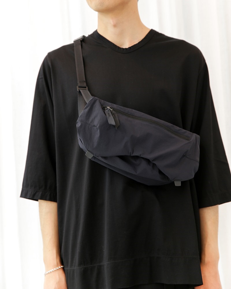 無駄な装飾を省き金具を使わず、ショルダーヒモもあえて華奢なコットンコードを使用し主張しすぎないシンプルさに気を配ったブランドらしさが感じられます。