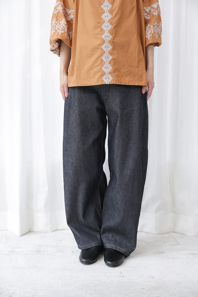 60年代のヴィンテージミリタリーパンツのディティールをベースに深めに設定した股上、ヒップまわりにゆとりをもたせた柔らかいフォルム、直線的なストレートシルエットで品のある女性らしさが際立つシルエットに仕上げたベイカーパンツです。