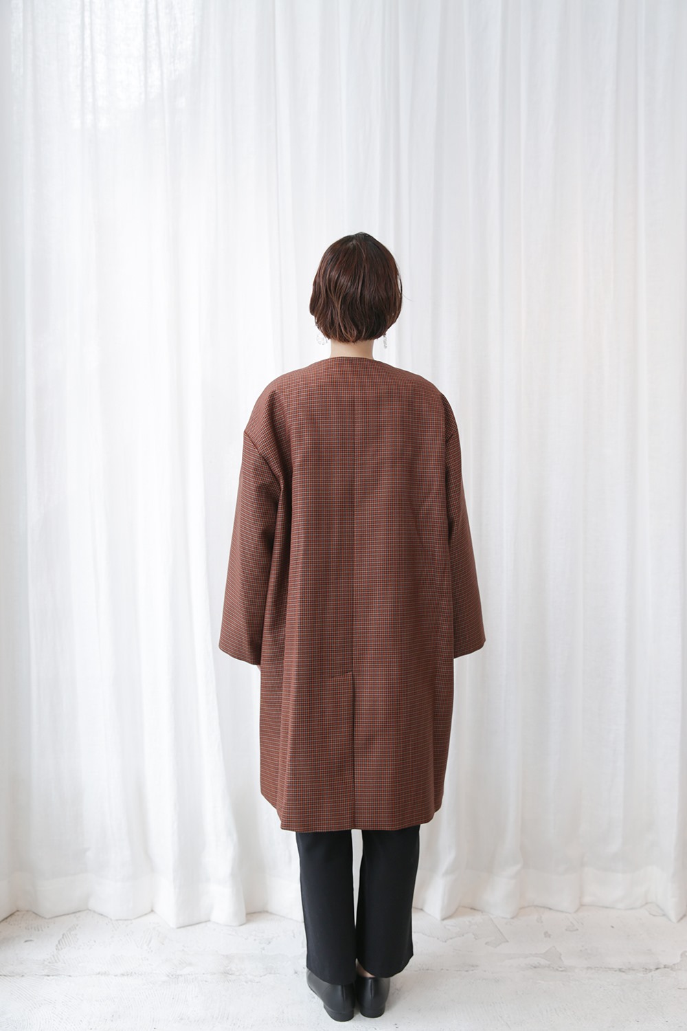 こちらは落ち着いたオレンジカラーのグレンチェックが印象的なノーカラーコート。