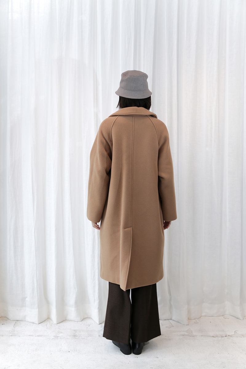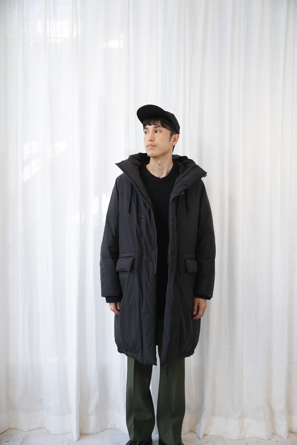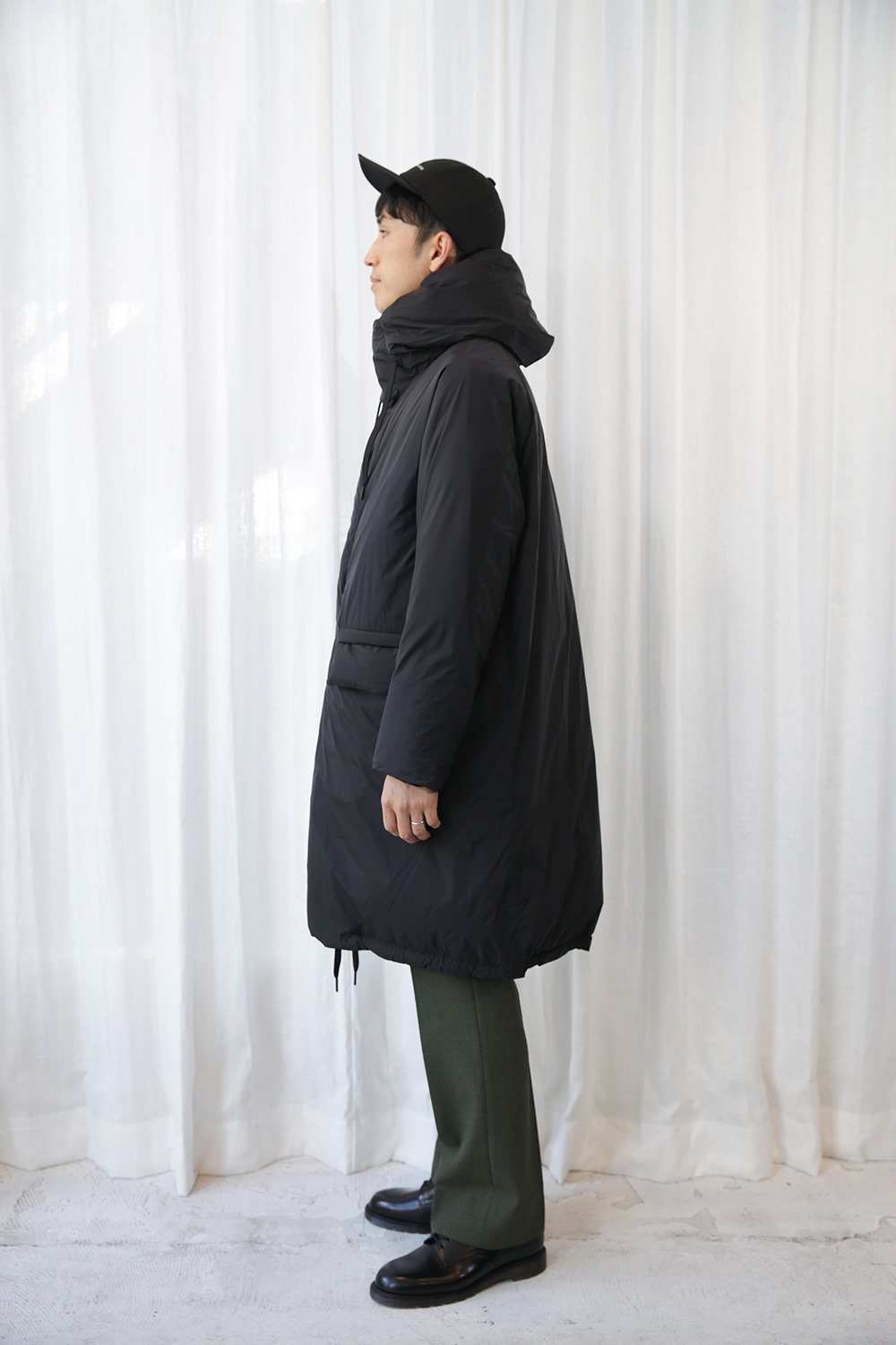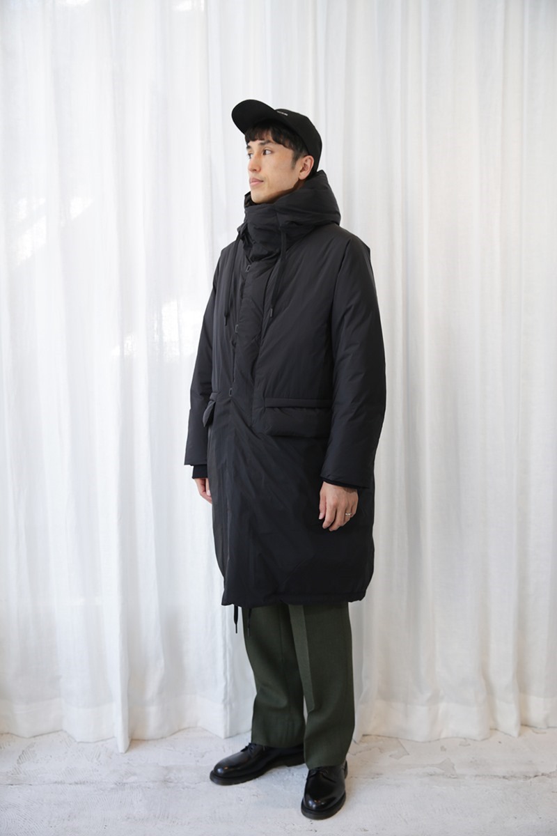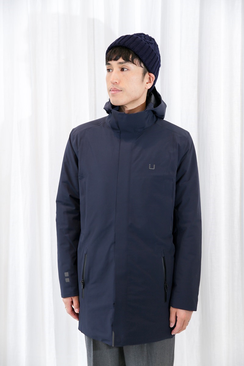 「TEATORAはビジネスウェアですので正直フードは必要ないんですが、SOUVENIR HUNTERというコートがありまして、TEATORAでは珍しいフードのあるコートです。これはビジネスで出張とはいっても、観光のひとつもするよ、ということで都市移動用に開発された、うちでは珍しいオフシーン用アウターです。正直なことをいうとダウンやフリース、レインウェアといった、アウトドアメーカーを連想する商品の開発は基本的に避けていました。ただ、観光という都市移動を目的にした場合、うちならではのダウンウェアが開発できる!ということで、2年ほど前から開発が始まりました。