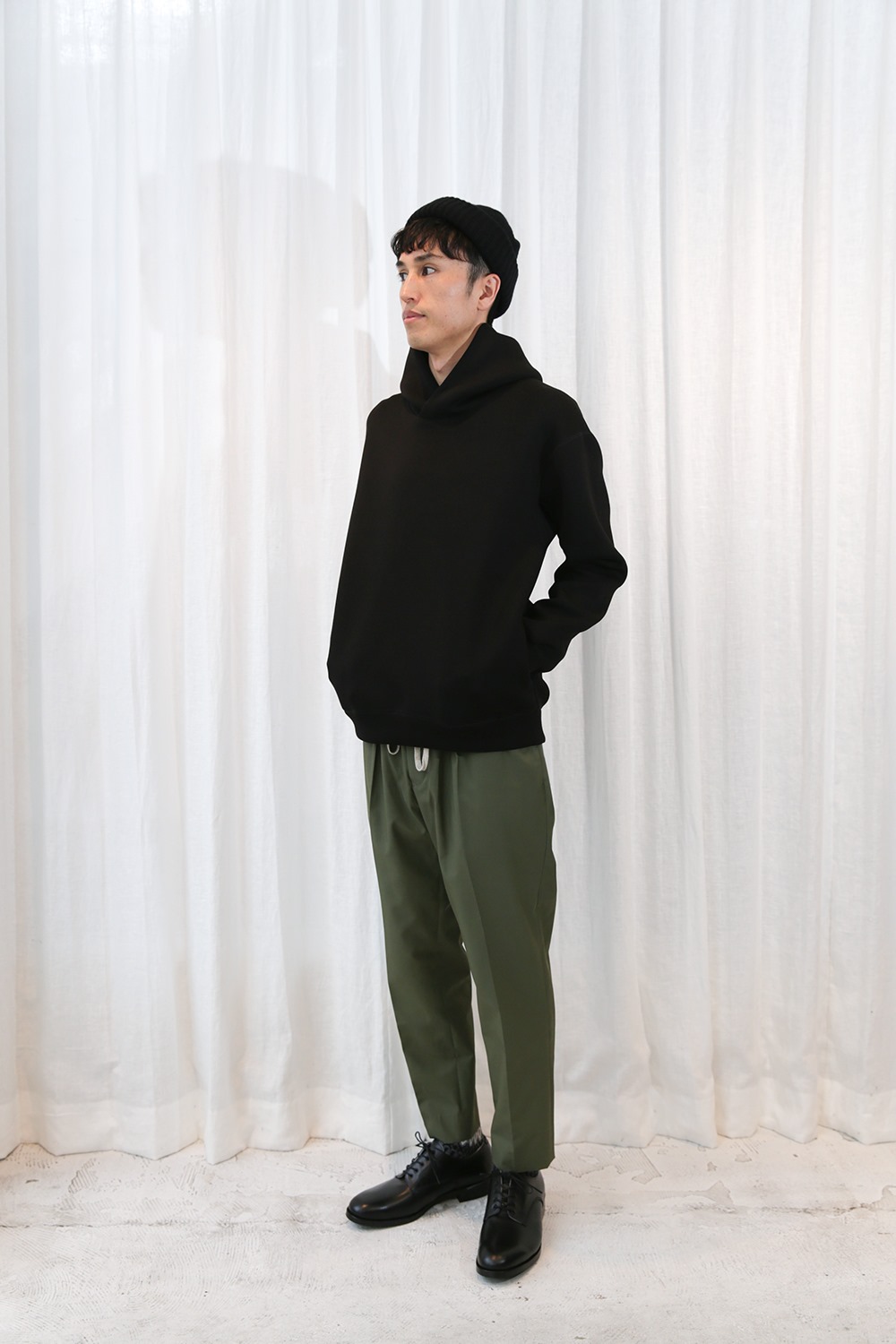 ニットやスウェットを着るのと同じ着こなしが出来、尚且つ織りの表情と緩やかなシルエットで見栄えの高いアイテム。