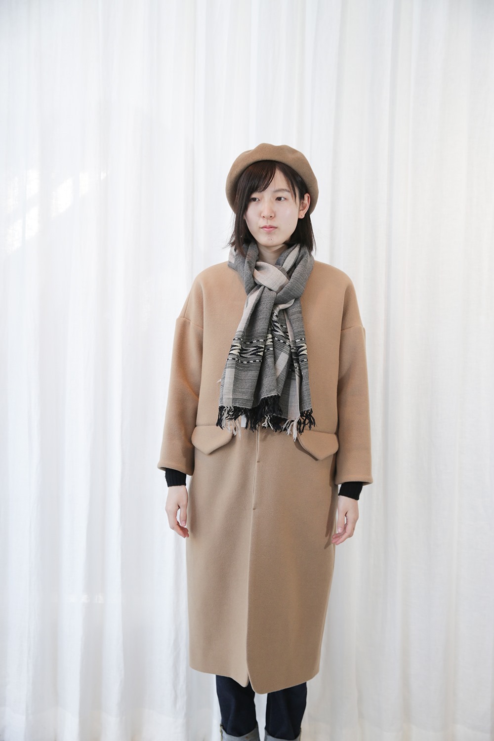 「NO CONTROL AIR|ノーコントロールエアー」 ベビーラムウールダブルクロスノーカラーコートを着て。