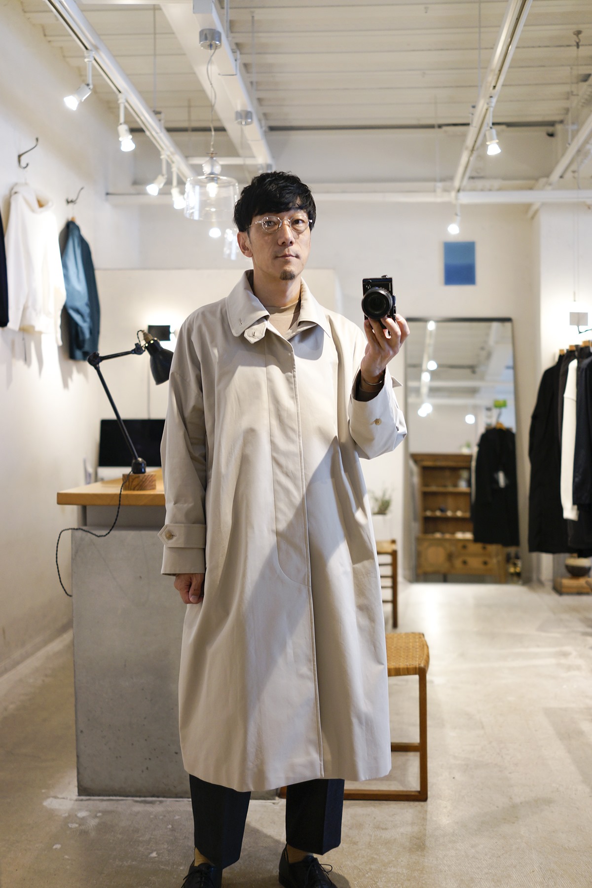 「Text|テクスト」Trenchcoat single-Brested Double Collar、着用。