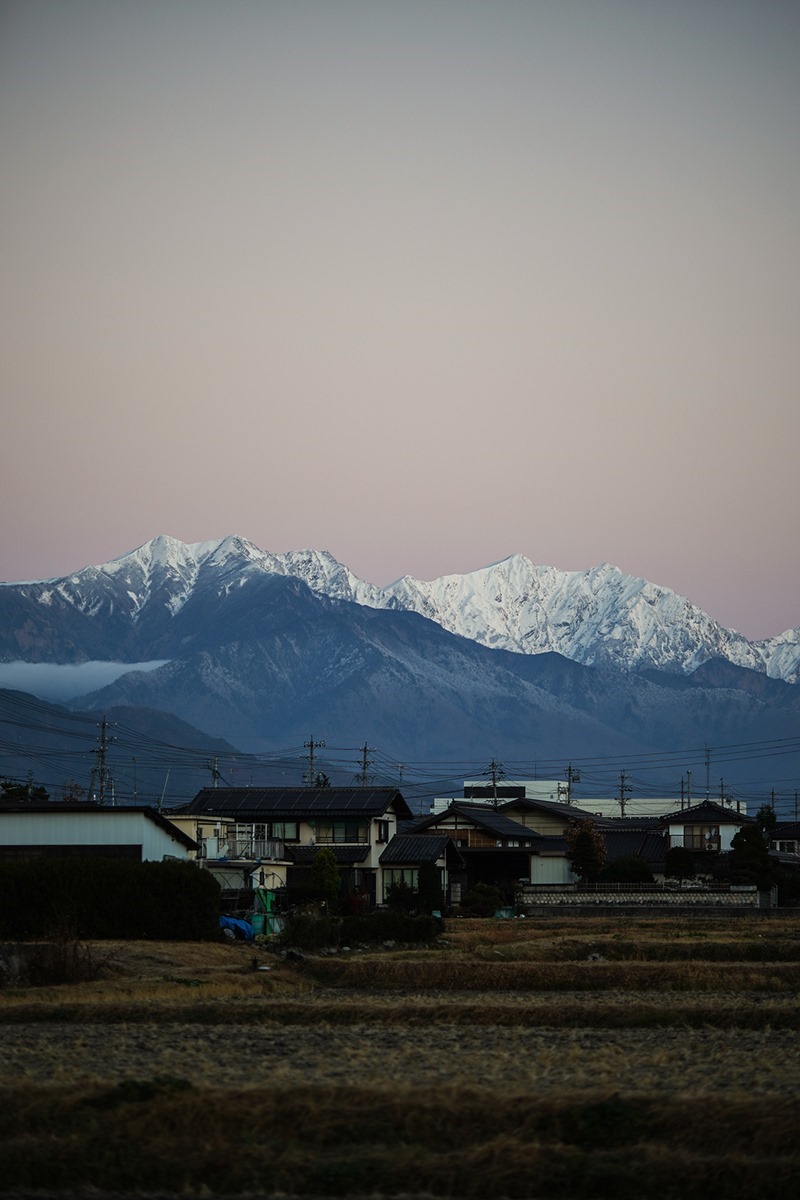 夜半、平野に降った雨は北アルプスに再度雪を積もらせ、その雪の白さに浮き立つ岩稜とピンクの空のコントラストがとても綺麗な朝。