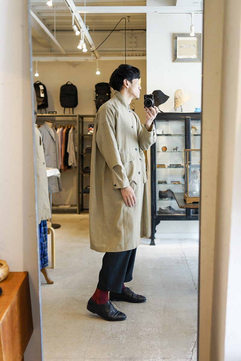 4素材の素材をミックスした平織生地、ヴィンテージ感のある風合いが良い表情。化繊素材が大半を占めますので丈夫で軽くシワにならず、清涼感のある春コートに仕上がっております。モスグレイミックスの色合いがすごく良い。