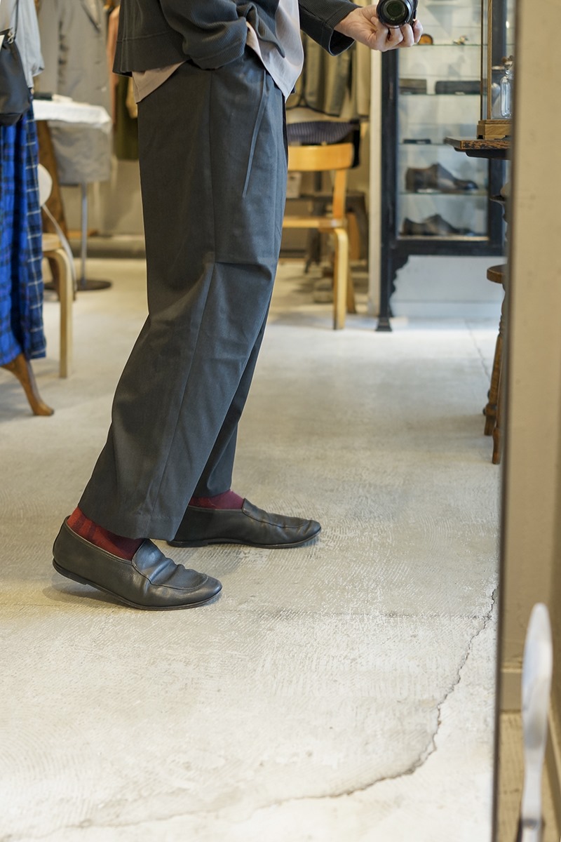 どちらも長年愛用されている事が分かる味わい深い表情と、でもお手入れが行き届いている艶やかでしなやかなルックス、どこのブランドさんの靴かは全く気にしませんでしたが、飾りっけなき極々シンプルベーシックな姿で、なんとも言えない味わいと品を纏ったその姿に気落ちが留まる。