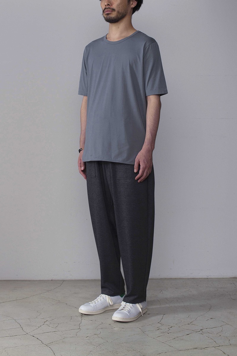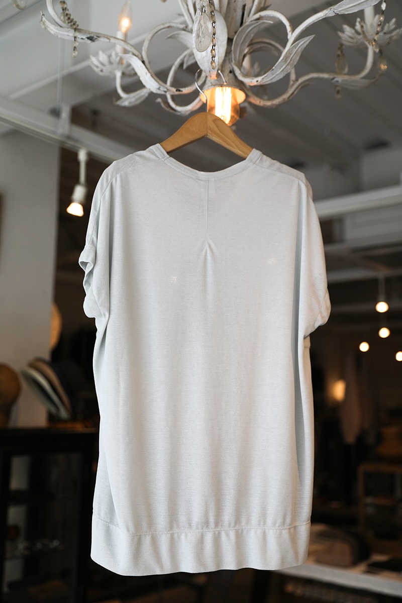 強撚したレーヨンを用いたジョーゼット編みのニット生地。肌離れも良く、涼しく、ドライ、夏に気持ちの良いTシャツです。