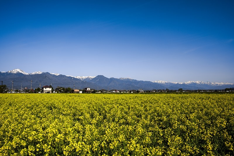 安曇野某所、菜の花絨毯の先に広がる青空と雪の峰。