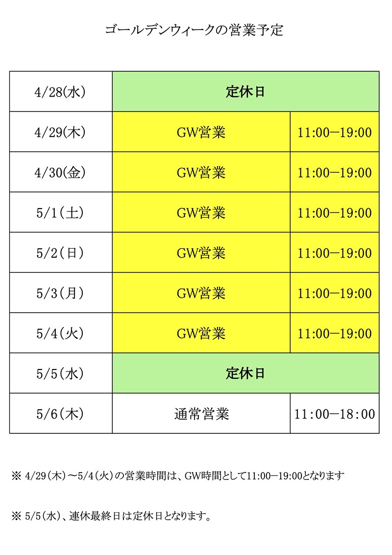 4/29(木)~5/4(火)までの営業時間が11:00-19:00と成ります事。