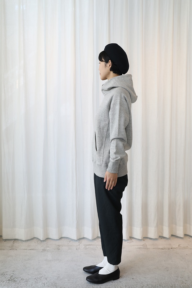 春夏シーズンは起毛をかけずに目を詰めることでほど良い生地厚とハリを持たせて、着用した時にボリュームが出るクロスフードが特徴。