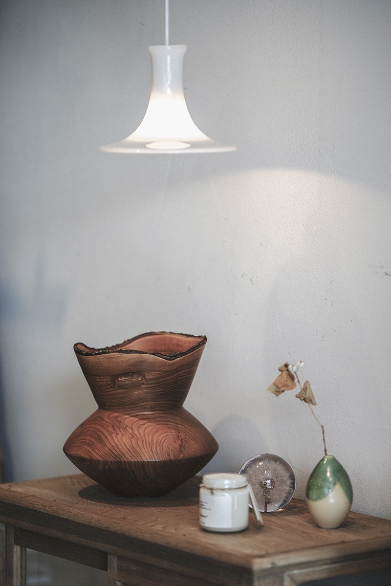 木工旋盤によって、肌触りや木目など大きな生木からそれぞれの個性を見つめながら、最も美しい木の表情を探し出し、作品作りを続ける。