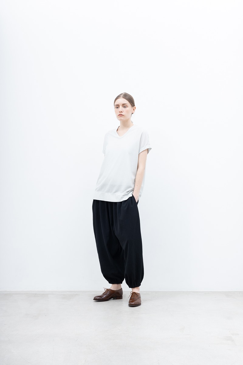ハリ感と軽さが特徴の経編機という編機で作られたエラシックトリコット生地、織物のように整経した縦糸に横糸を絡ませて編んでいくため、通常の編み物に比べて伸度が少なく編み物の通気性や軽さと織物のハリ感を併せ持つ清涼感を感られる素材。アメリカ軍のM-51オーバーパンツをモチーフに過剰なディテールをそぎ落としストンと落ちるスラックスのようなイメージで仕上げている。ウエストはエラスティックゴム+ドローコード仕様にし、サイズアップでぎゅっと縛って穿いても様になるシルエット。