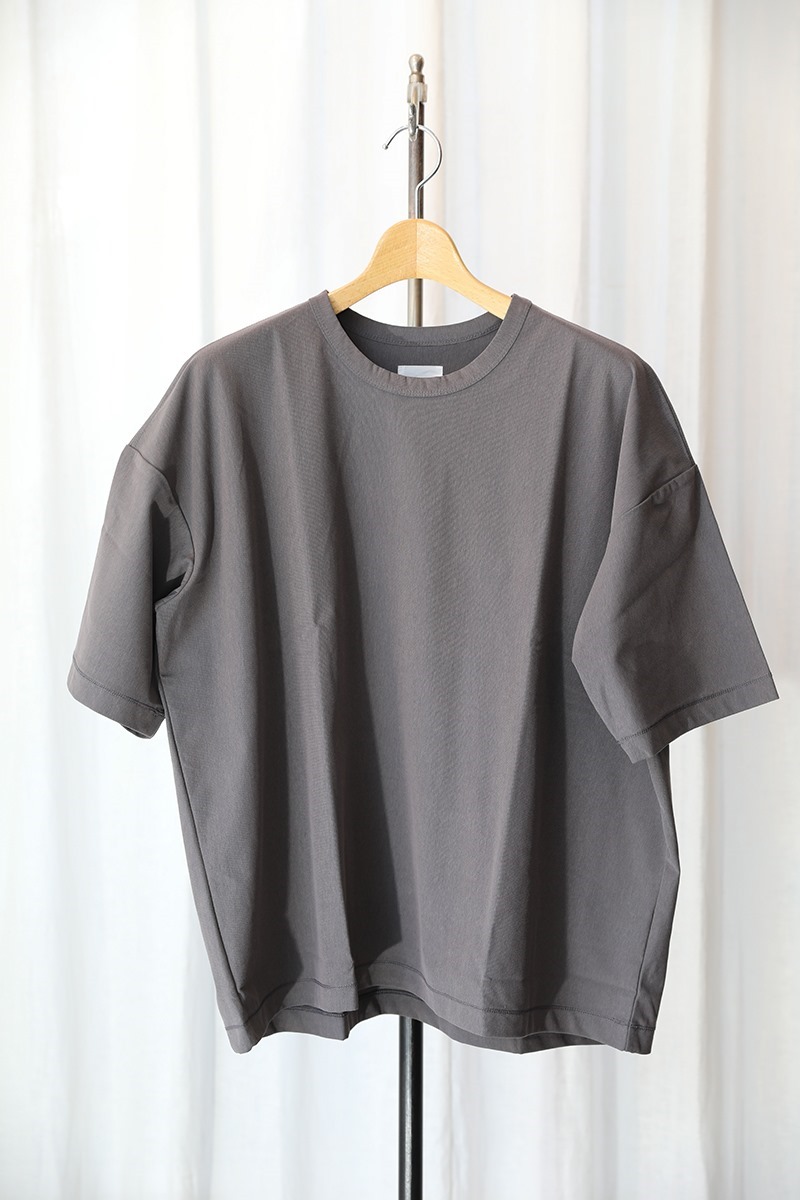 細番手の糸を使い密度を詰めながら厚みを抑えて仕上げられた経編ストレッチピケトリコット素材。柔らかく伸縮性があり綺麗なドレープがでる生地感。コットンとポリエステルをミックスすることで生まれる自然なフェード感も特徴。身幅を広くとり着用することで体に沿ってドレープしラインが整うシルエット。着丈や袖のバランスを調整することで自然なラインが出るようにしている。