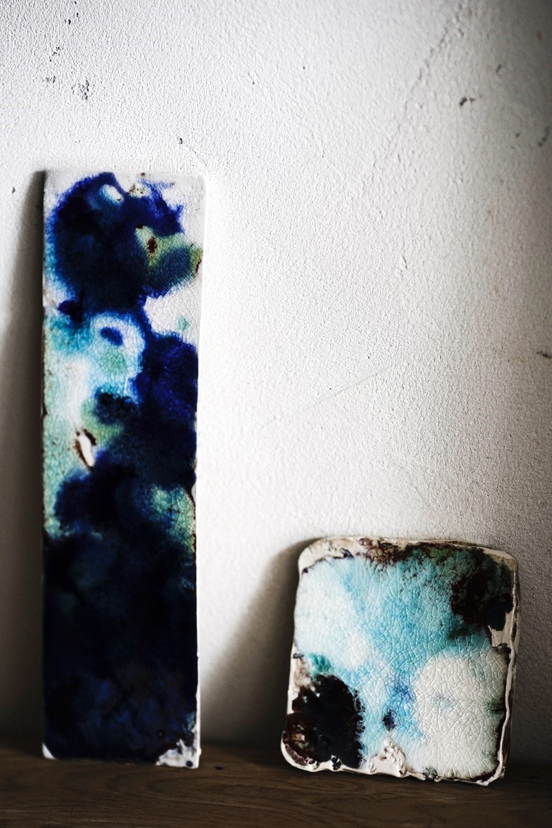 気鋭の作家さんを巧みな表現と発信力でご紹介くださる東京のギャラリー「水犀|ミズサイ」さんで岡野さんが今年の1月に個展「水棲」を開催されており、その時のインスタレーション、アートワークと融合した白地にガラス質釉薬の青や水色の綺麗な色合いに衝撃を受けた。