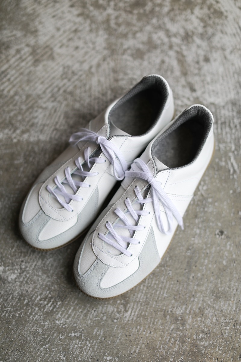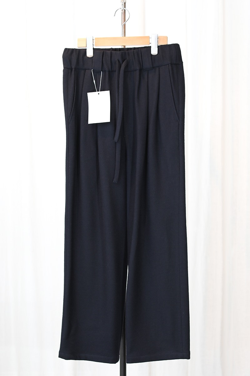 ミルドウールの持つ特性を生かし、最良のシルエットのベーシックパンツを追求しました。ウエスト周りはイージー仕様ですが、幅広のベルトループや綺麗にドレープし、陰影を生む 2 タック、共生地のドローコード、主張の少ない玉縁 PK などのディテールの積み重ねと、ワタリ幅やヒップ周り、股上の深さなどトライアンドエラーを繰り返し完成したパンツです。テーパードは殆どせず、ストレートシルエットですが、裾の三つ折り部分を折り返す事でややテーパードを作る履き方も面白いです。
