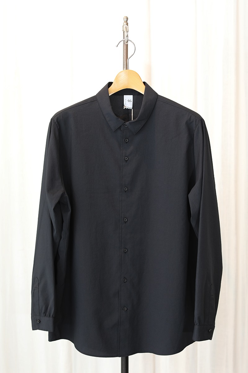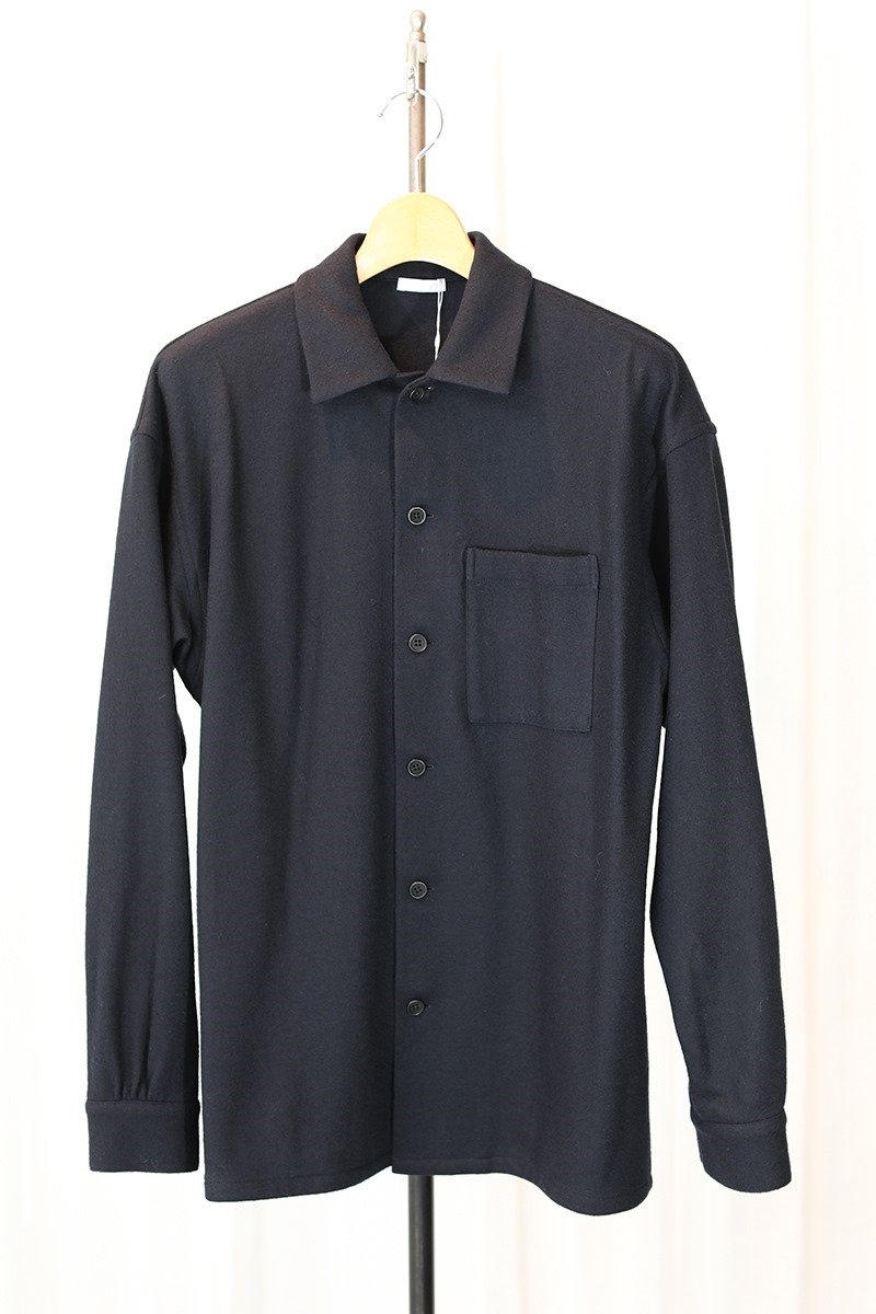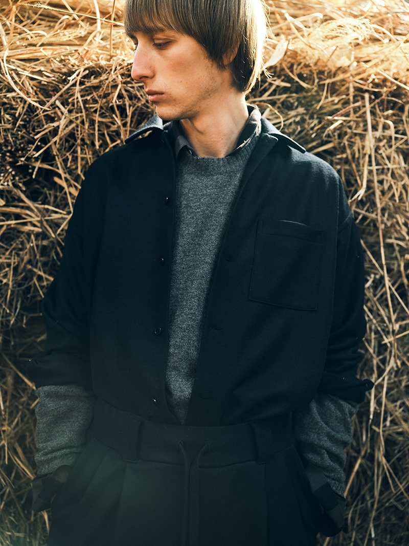 アメリカ海軍下士官チーフのユニホーム CPO シャツを Blanc YM らしく表現しました。素材には尾州産地にて上質な 24 番手ウールを梳毛糸を 18 ゲージの機械にて天竺で編み上げ、更にミルド加工をさせ粗野なタッチを残しつつもプレーンな表情になりました。シルエットとして最大の特徴は後ろ姿です。センターにややアンバランスな程大きく摘み、綺麗に丸みあるシルエットが出来、立体的なシルエットでライトアウター然としたプロダクトです。削ぎ落としたプレーンなヴィジュアルですが、袖口にはランダムに入れたギャザのディテールなど静かに、しかし力強い1着となりました。