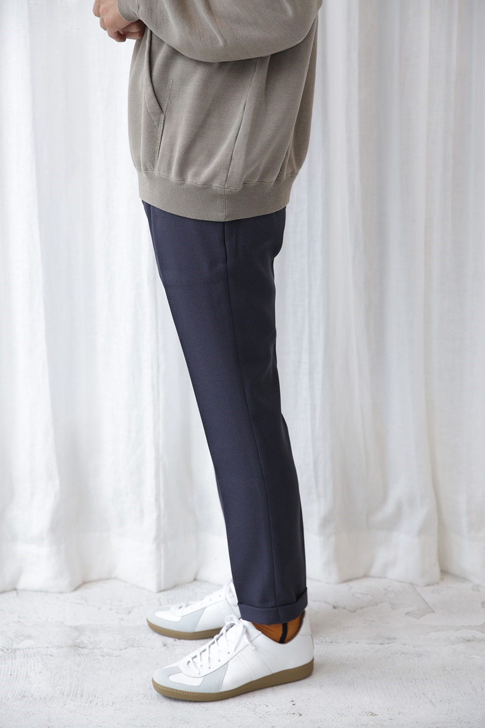 クラシックなポリエステル100%の中肉ツイル素材。型はワンタックでヒップ周りにややゆとりがあり、膝から裾にかけての細めのテーパードシルエット。センタープレス入りで裾はダブ上げ仕様。素材の特性上、シワになりにくくイージーケアなのが嬉しい。レザーシューズにもスニーカーにも合わせ易いカジュアルスラックス。ロゴ刻印入りの本水牛ボタンを使用。