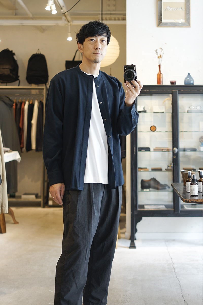 前立てに変化を付けることでプルオーバーシャツのようにアレンジしたバンドカラーシャツ。シャツ本来のトラッドな雰囲気にバンドカラーと素材感でリラックス感を持たせている。すっきりとしたバンドカラーはインナーに合わせてもコーディネイトの干渉が少なく幅広いスタイリングを楽しむことができる。カフスは手首に沿うようにカーブさせ、ボタンの位置も手首側に付いているため手首に被さり、レイヤードした時にカフスがさりげなく覗くディテール。また、台衿とカフスのステッチを省くことで柔らかい印象に仕上げている。