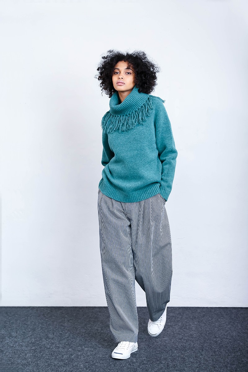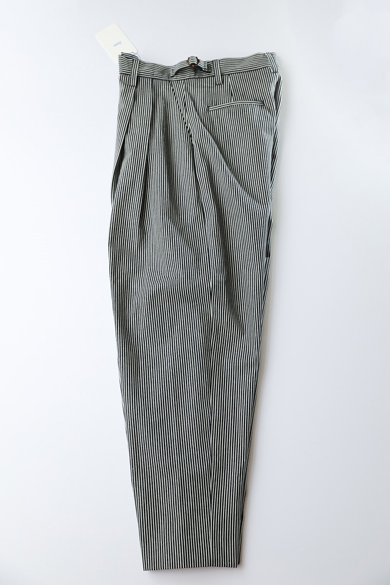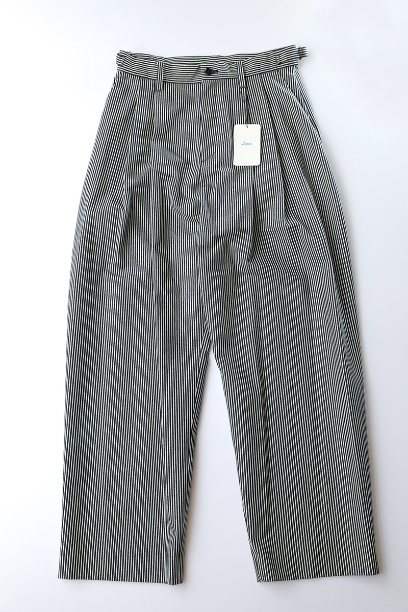 タックを入れた前ウェスト、両脇にバックル、ヒッコリーストライプのワイドパンツ。