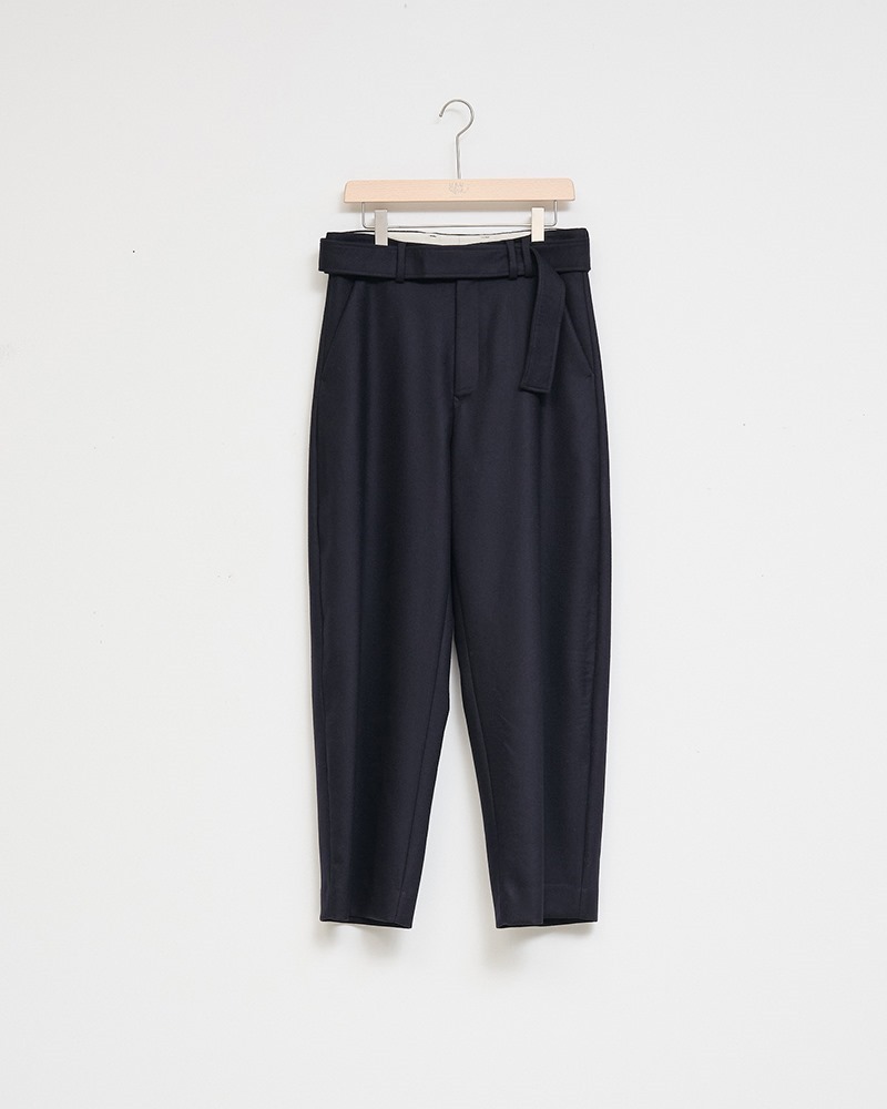 やや黄身がかったオリジナルのグレーで縦糸を染色し、石などの自然物の表面に見られる規則性のないランダムな現象をドライタッチなシルクネップを使って表現した、ワッシャー仕上げのオリジナルシルクネップウール生地゙。ランダムな現象を再現しながらも、適度にハリ感と落ち感がある素材で、見た目以上に柔らかいタッチでウエイトも軽く、また吸放湿性に優れ蒸れにくい。尾州の職人の仕込み・仕上げの高い技術が詰まった日本製のファブリック。裏地は、特殊な洗い加工でシワ感を作りながら、滑りとタッチの良さの両立を可能にした、日本製の高密度タイプライターを使用。ストンとした落ち感で絶妙にテーパードさせたストレートシルエットの2tuck Slacks。