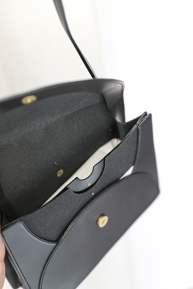 foldシリーズのショルダーバッグ 長財布、スマートフォン、手帳など普段使いの荷物が入る使い勝手の良いサイズのショルダーバッグです。 半円が重なりあったデザインのフラップを開くと、それぞれの仕切ごとにナンバリングされた三層の円が現れます。奥の部屋には8cmのマチがあり、厚みのある荷物も入ります。手前のポケットには中仕切りがあり、スマートフォン、カードケース、小物類などが小分けに収納できます。 ショルダーベルトはバックルの穴がない構造のため簡単にお好みの長さに調節できます。