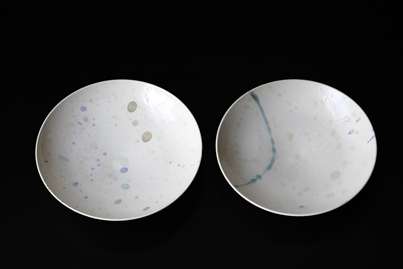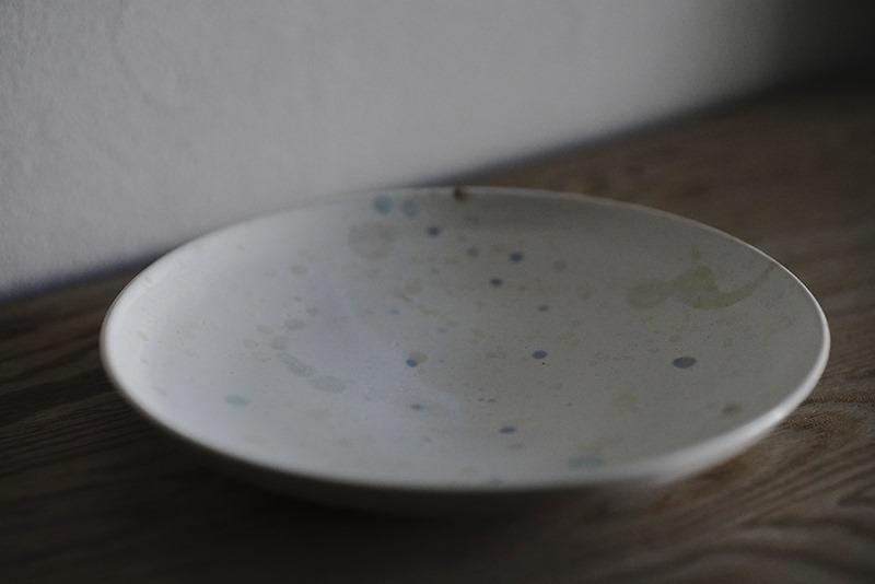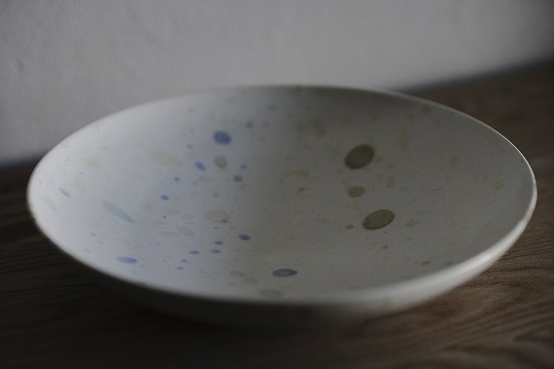 全体を彩るエクリュ色の釉薬に淡く優しい色合いのとばし釉がリズミカルに踊るお皿。