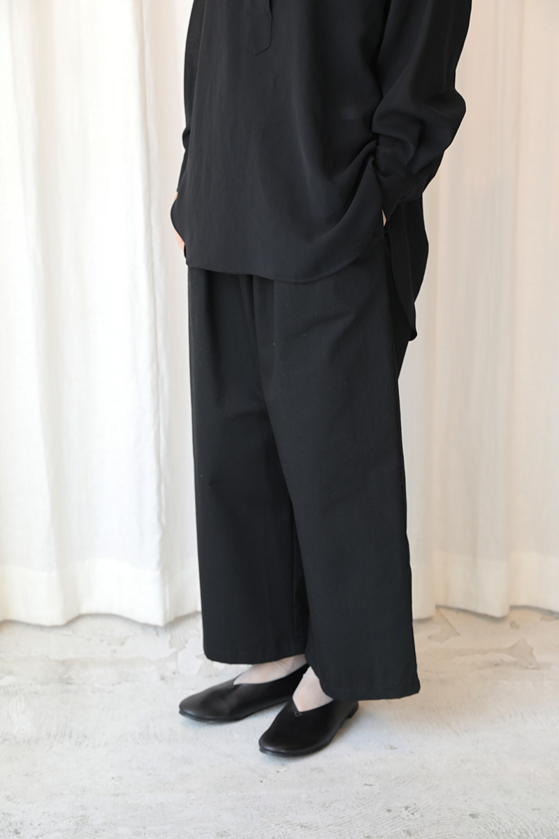 強撚した綿糸で織り上げた肉厚でシャリ感のあるカルゼ生地。シワになり難く落ち感のある風合い。ややゆったりのテーパードシルエット。ウェストはゴムと紐を配置。
