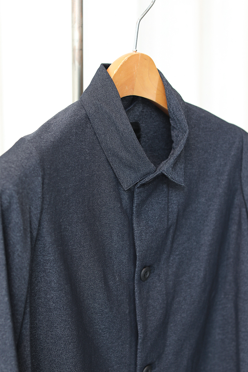 "DUAL DIVISOR"生地は、シーズンを問わず、合わせる服も問わずお使いいただける生地。デニムの綾織りを化繊にて表現し、その柔らかな印象の表層によって着用者の印象そのものを柔らかくし、堅苦しさを中和することで様々なTPOでスタイリングいただけます。