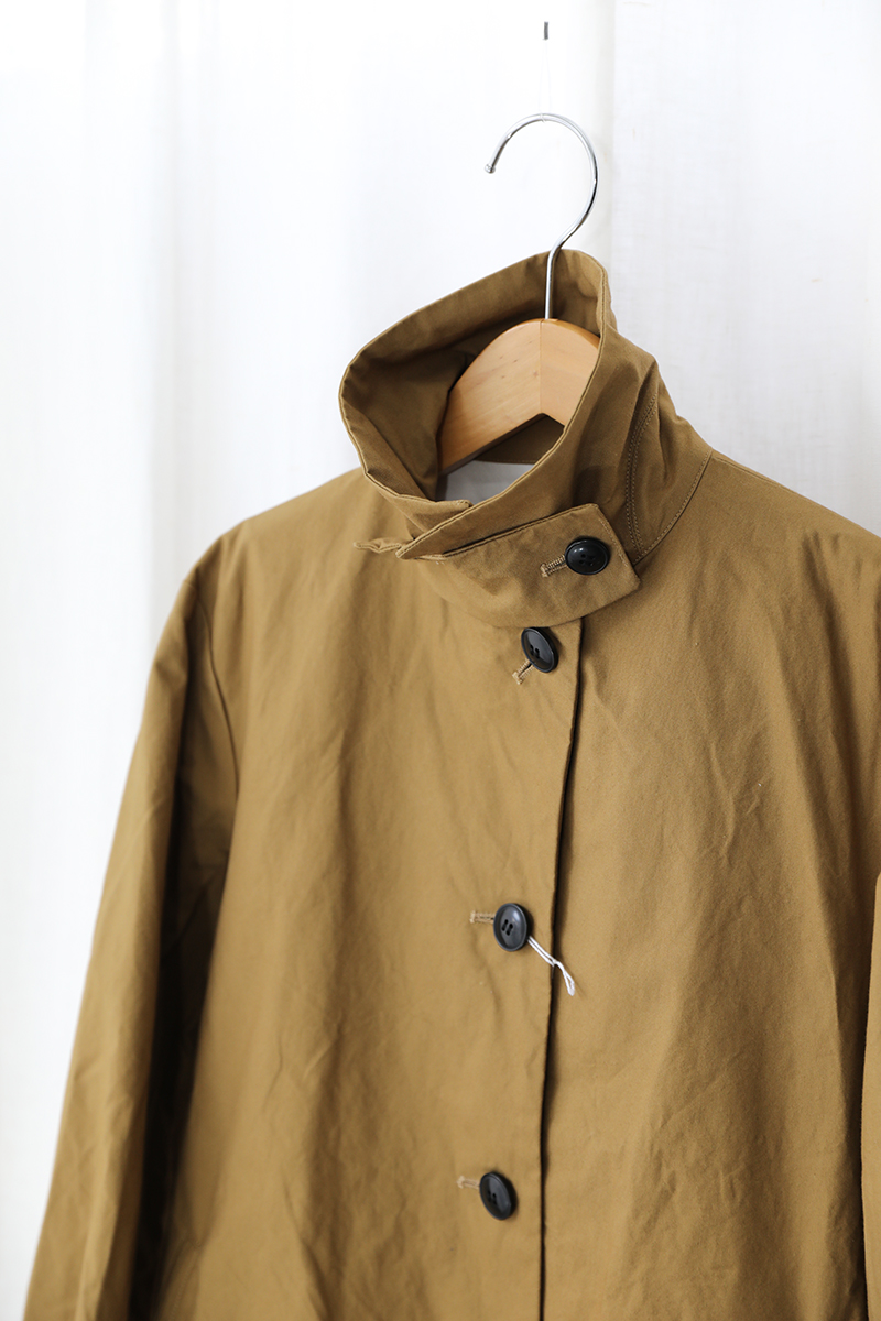 同ブランドが10年来作り続けている春のアイコン的アイテムのスプリングコート。表地は馬と鞍の間に敷く細い糸を高密に織り上げた丈夫な、馬布(コットンホースクロス)を使用。風を通しにくく、春先の早いシーズンから着て頂けるコートです。またエイジングを楽しめるのもこの生地の特徴で、ご自宅で洗うことを想定したつくりになっています。表地と裏地の縮率が異なるので洗うと表地が縮み、裏地と表地をあえて袋縫い仕様にしているため裏地の白がひっくり返ってくることで洗う度にコートの裾がふんわりと膨らんでいきます。お手入れをしながら着ていただく中で出る風合いも楽しみながら長年着楽しんでいただけるコートです。