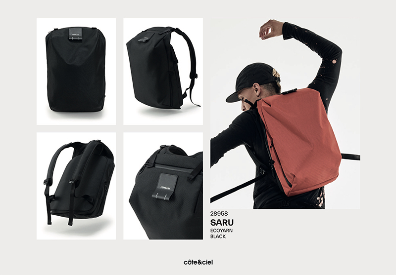 普段のお出かけから、ビジネスシーンでお使いいただけるミニマルデザイン。メインコンパートメントに15インチPCまで収納できるクッションスペース配置、超軽量モデル。撥水・耐久性も高いペットボトルリサイクル素材で作られたオリジナルエコヤーン素材。