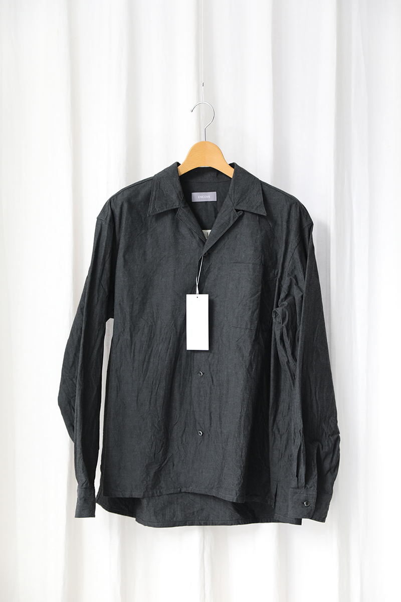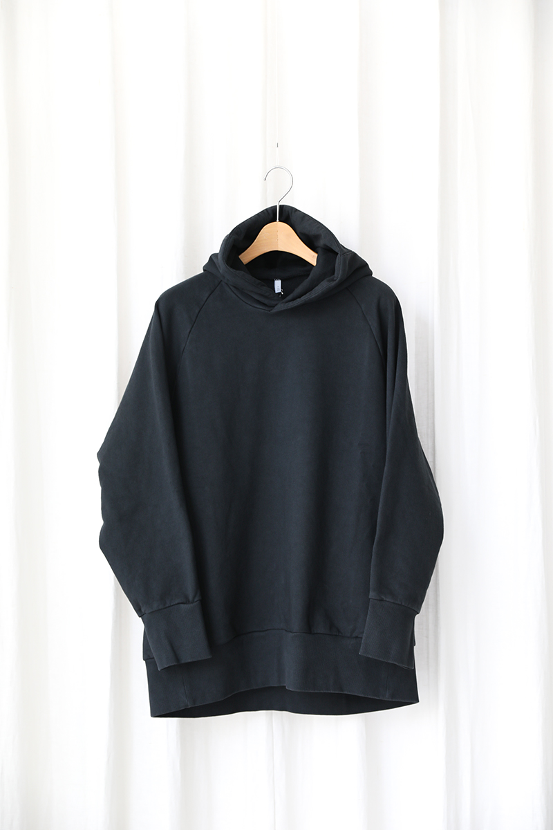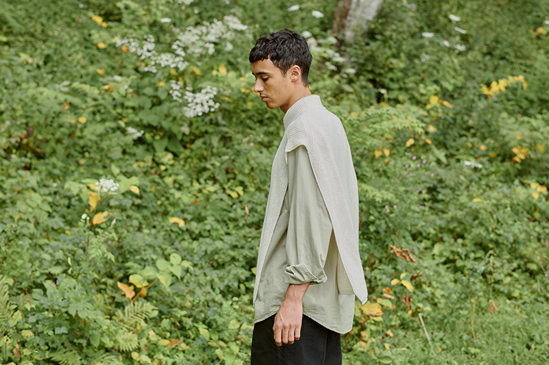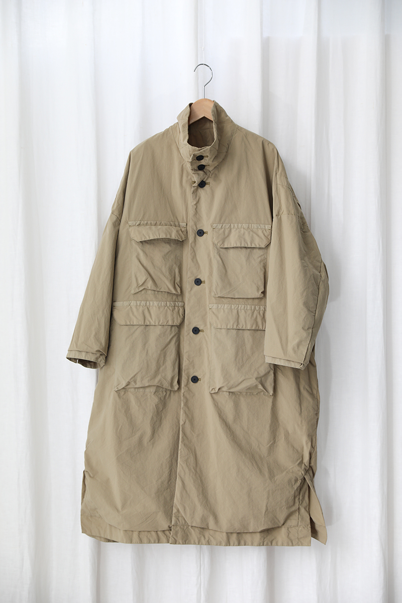 表地は馬と鞍の間に敷く細い糸を高密に織り上げた丈夫な馬布(コットンホースクロス)を使用。風を通しにくく、春先の早いシーズンから着て頂けるコート。またエイジングを楽しめるのもこの生地の特徴で、ご自宅で洗うことを想定したつくりになっています。表地と裏地の縮率が異なるので洗うと表地が縮み、裏地と表地をあえて袋縫い仕様にしているため裏地の白がひっくり返ってくることで洗う度にコートの裾がふんわりと膨らんでいきます。お手入れをしながら着て頂く中で出る風合いも楽しみながら着て頂けるコートです。"WORLD"はオーバーシルエット、ノーカラーデザイン。