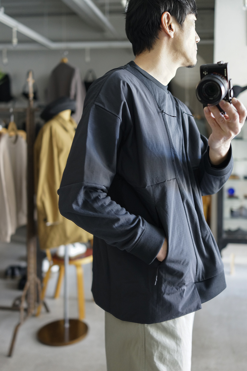 異素材を組み合わせて製作したレイヤードプルオーバー。ゆとりあるリラックスシルエットに仕上げています。表はメッシュのカットソーとリップストップを長短差で組み合わせたエッジあるルックス。裏地は接触冷感生地、起毛感あるネット状のラッセル素材を採用しています。春のアウターをプルオーバーアイテムで表現した一枚だと感じました、秀逸。