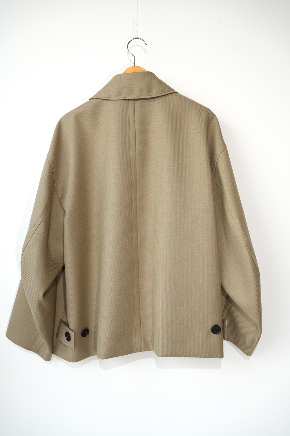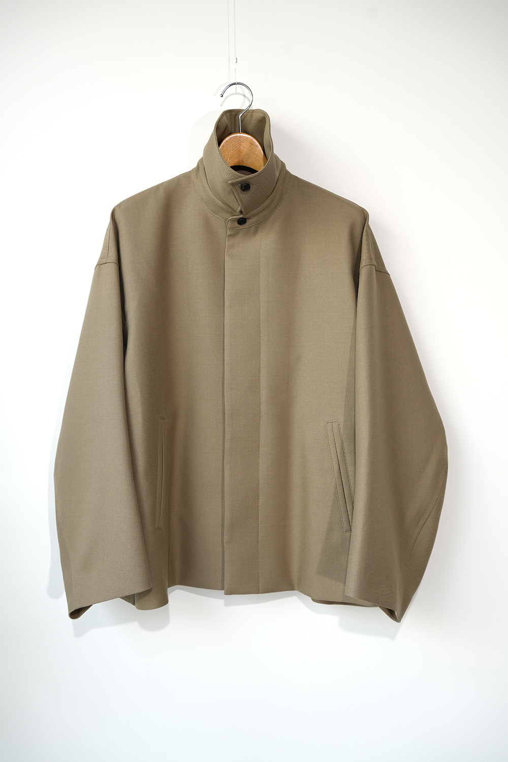 ボックスシルエットのフライフロントジャケット。肩は適度に落とし、袖筒はパイロットジャケットの様にエルボー部分にボリュームを持たせたパターンメイク。尾州で生産した縦糸横糸で色の濃度を変え色味に深みを出したオンブレーカラーのウールカルゼ生地。更にヴィスト加工を施し弱撥水、適度な反発性としなやかなタッチを実現した生地です。
