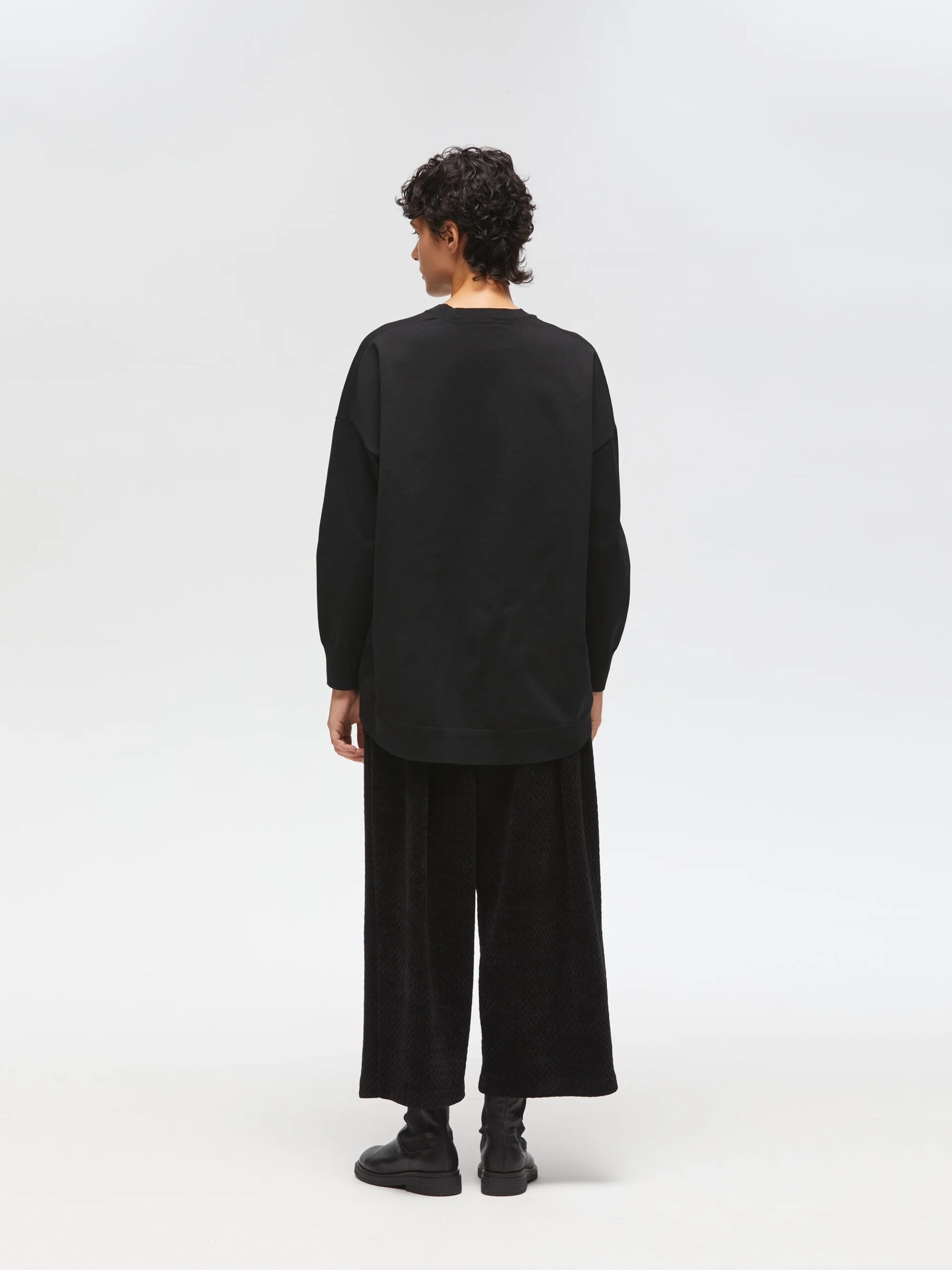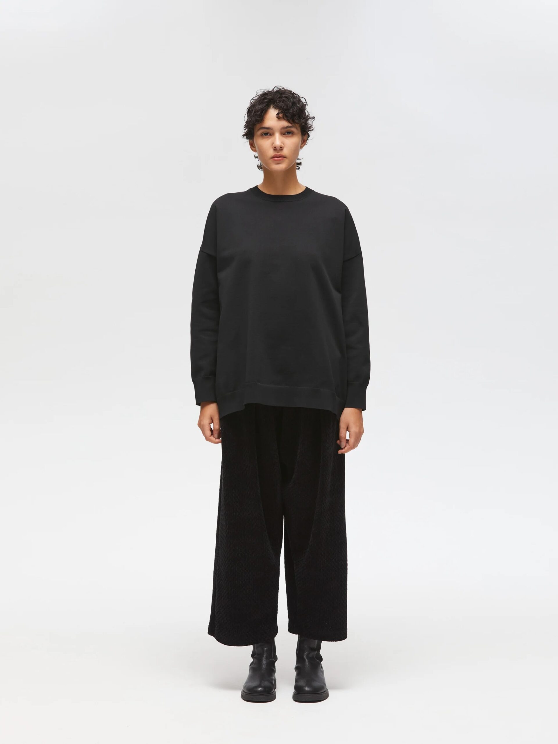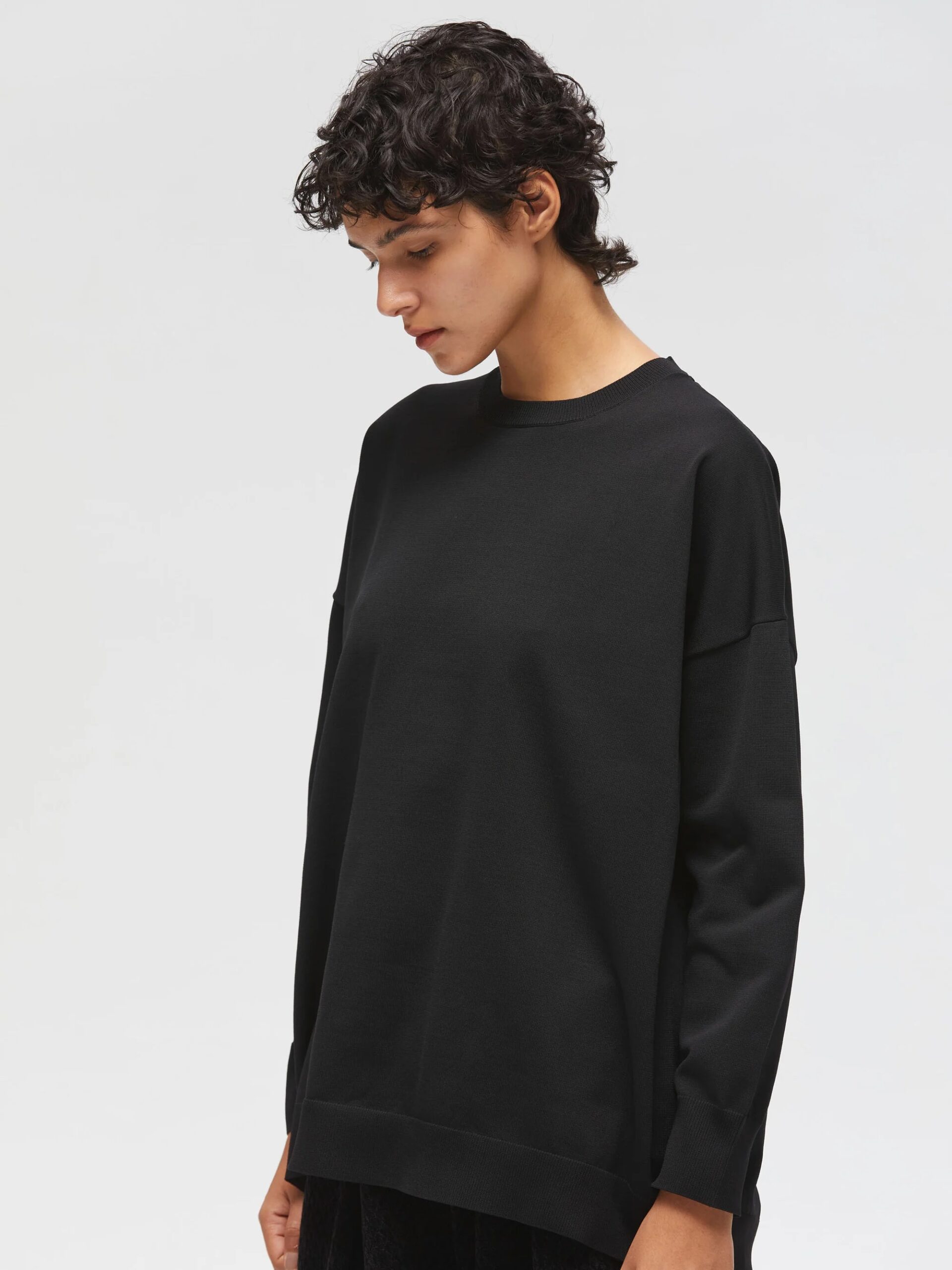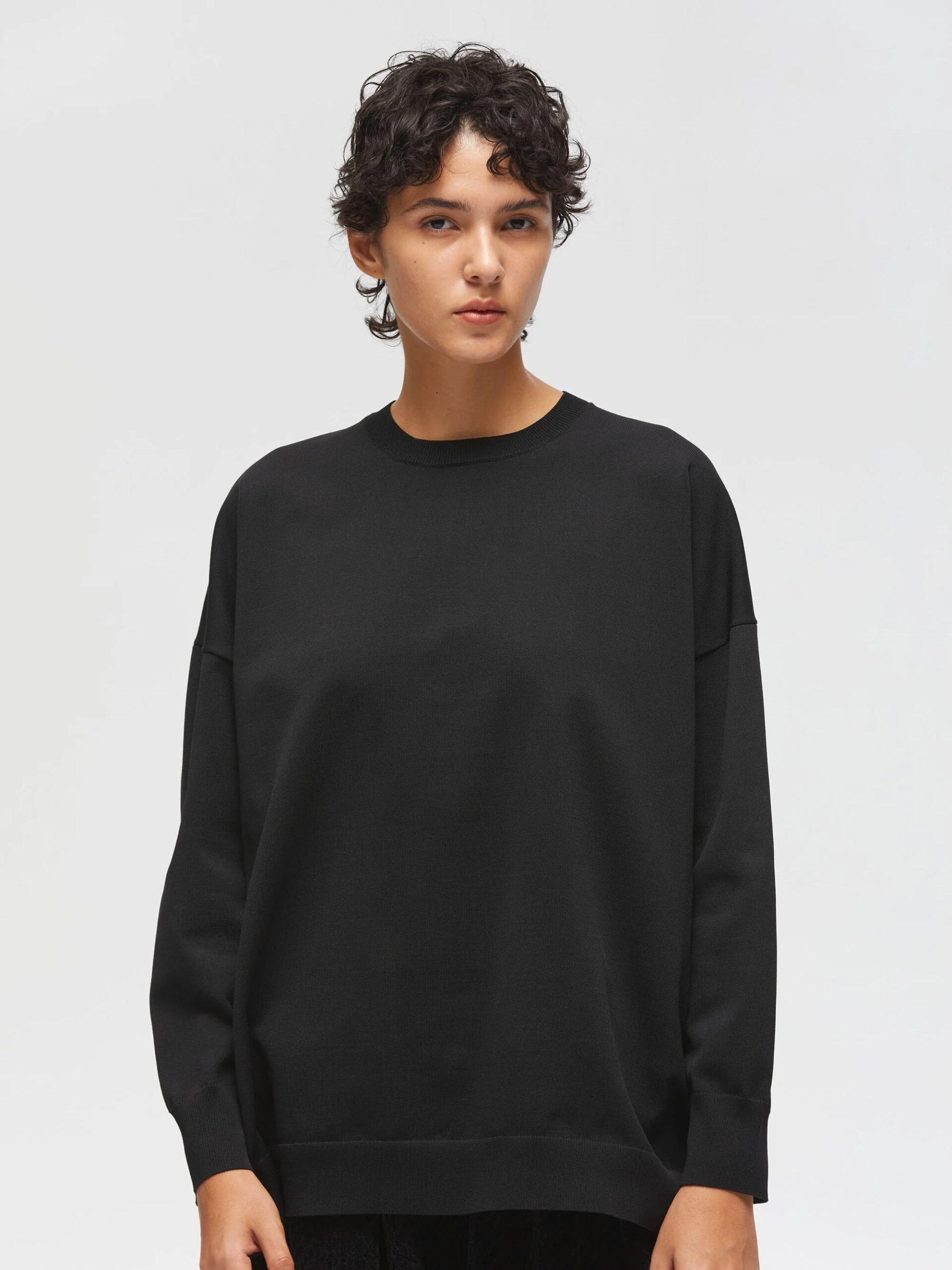 mizuiro ind定番シリーズのトレーナーを、ニットで表現したワイドプルオーバーです。ゆったりとしたワイドなサイズ感が特徴で、ヒップの隠れるロング丈に前後差をつけた丸みのあるラウンドヘムデザインがポイント。すっきりとしたクルーネックリブが女性らしさを演出し、太めの袖リブはロールアップもしやすくなっています。素材には天竺畦編みの合成繊維ニットを使用。ストレッチ性があり、着心地は快適でカットソー感覚で気軽に着られる上品な印象です。シワになりにくく洗濯も可能なため、デイリーに活躍します。