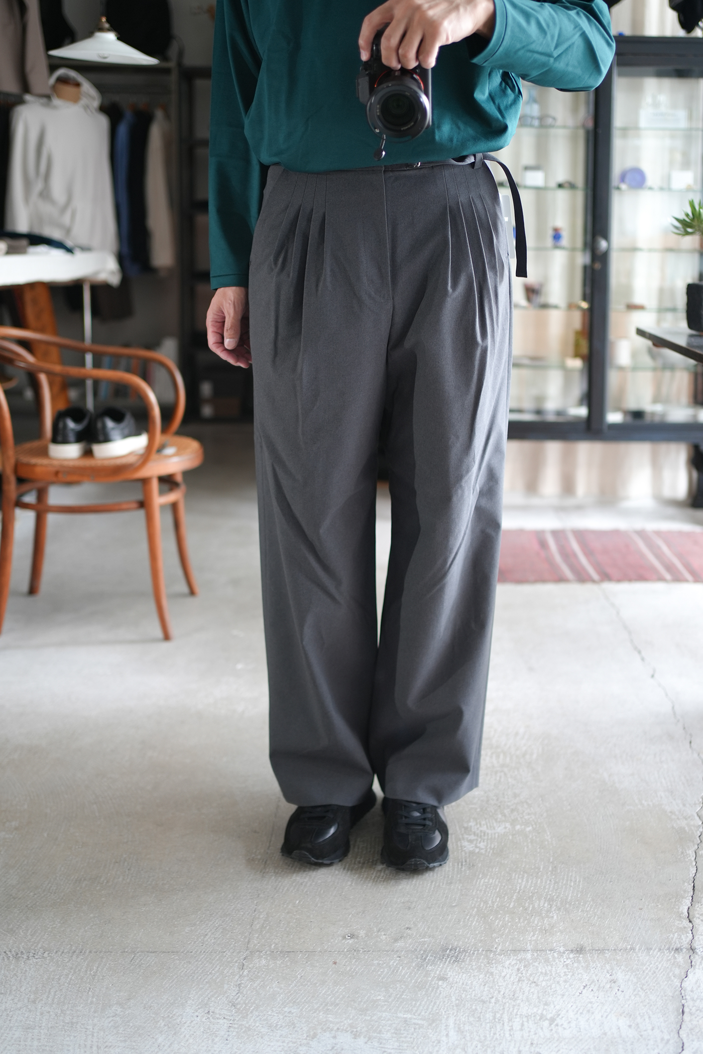 SOLOTEX(化繊生地)を用いた4タックワイドストレートパンツ。綺麗さのあるスラックスデザインであり、ガシガシ穿けご家庭洗濯頂けるイージーケアさが嬉しいパンツです。ウェストはフロントに配されたベルトで調整いただけます。