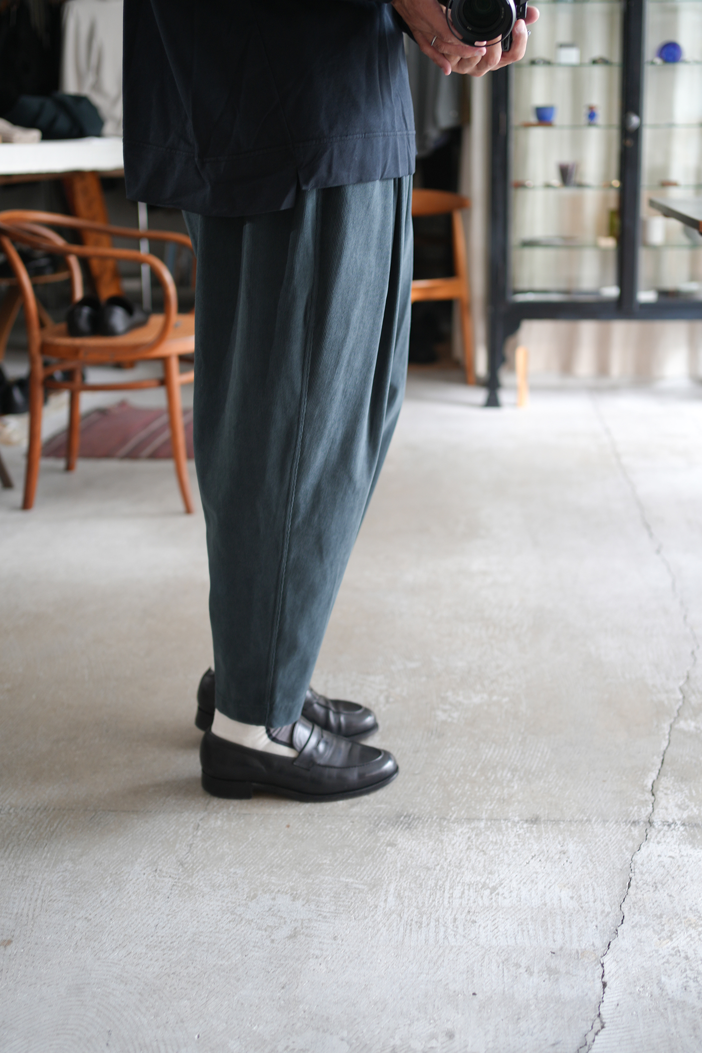 テーパードシルエット、ウェストゴムと紐仕様、8.5部丈。