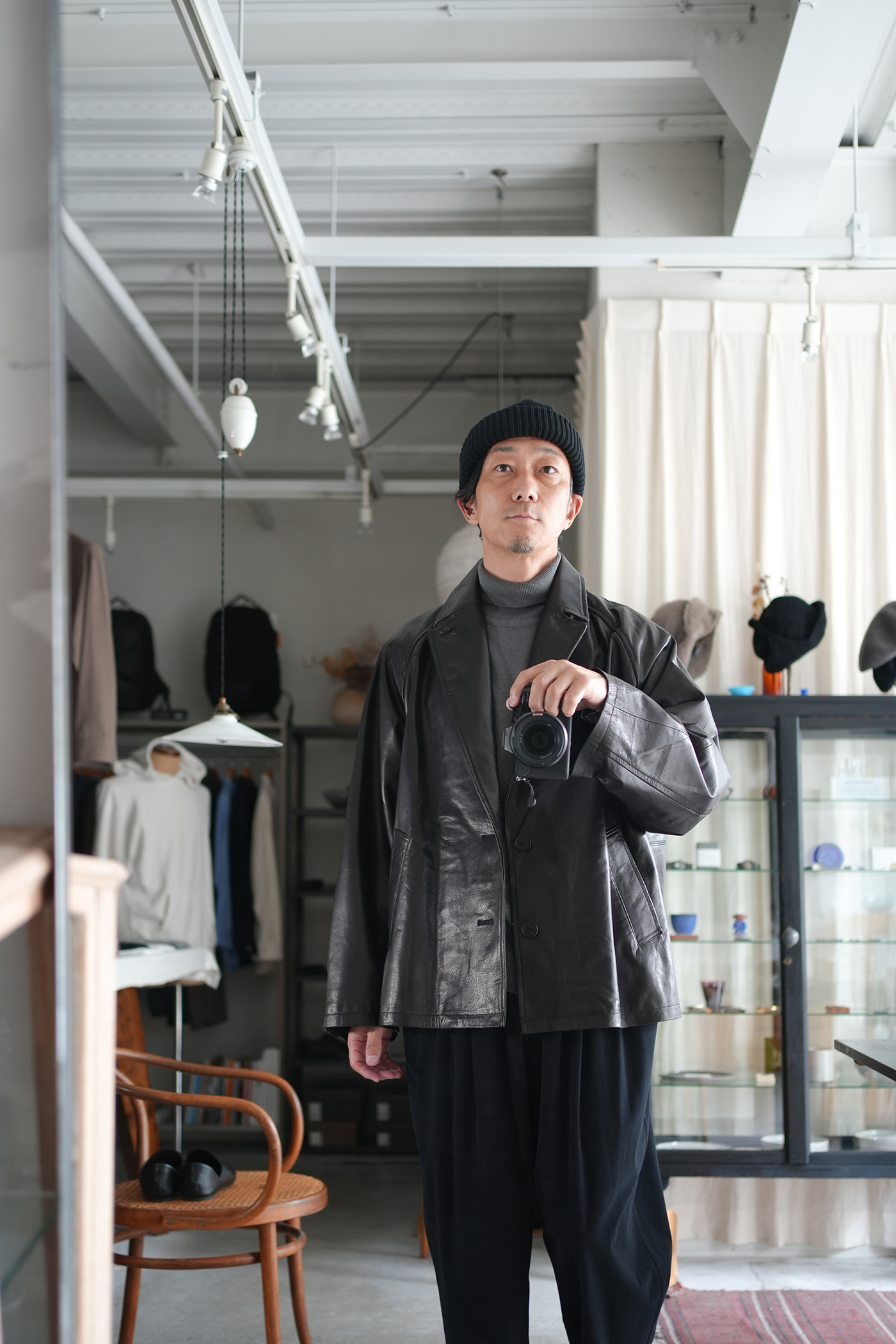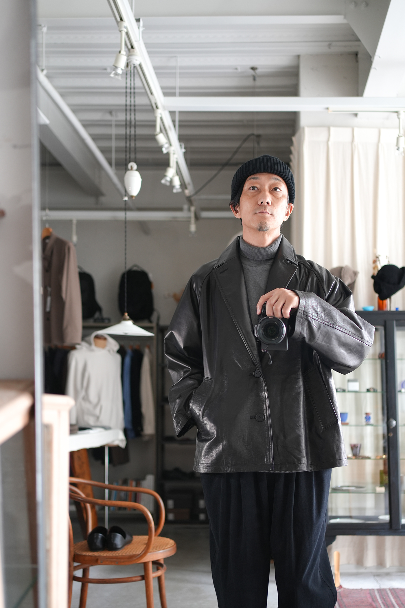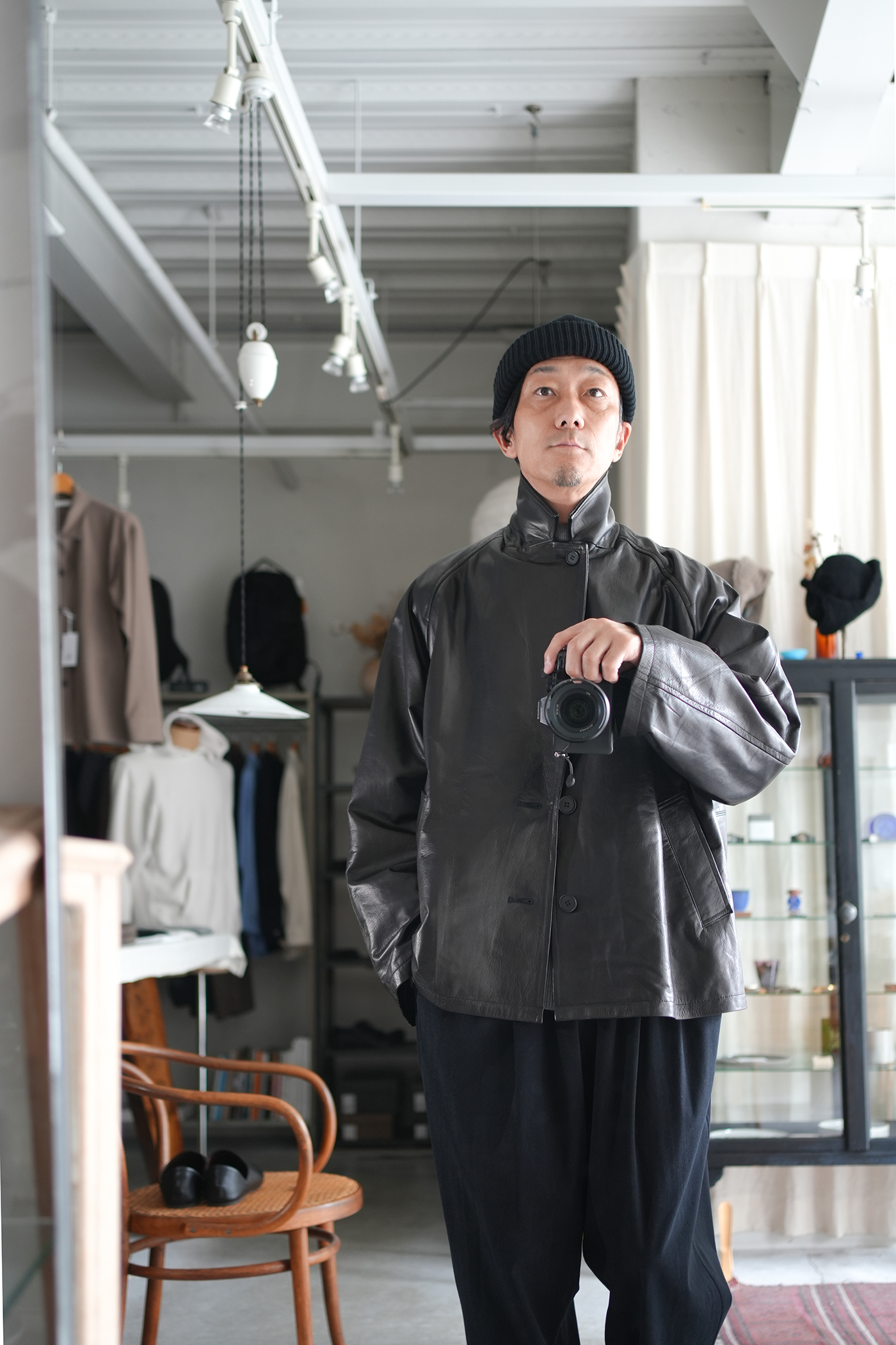 オーバーサイジングで仕上げたシングル2Bレザージャケット。ボックス型シルエット、箱ポケット、ラグランスリーブの形状なそブルゾンの様な着用感。襟先をボタンで留められる事によりコートの様なスタイリングの変化を楽しめる。前見頃はレザーを剥がず1枚もので仕上げている美しく贅沢な仕上げ。驚くほど軽量でしなやかなレザージャケットで軽快にスタイリングいただけます。レザーは日本の老舗タンナーにて製作された極薄のカウレザーを使用、なめしの工程で石灰液につけ革をソフトにし、薄いながらも強度のあるレザー、まるで布帛のようなドレープ感があり、レザーアウターながらストレスのない着心地が素晴らしい一着です。