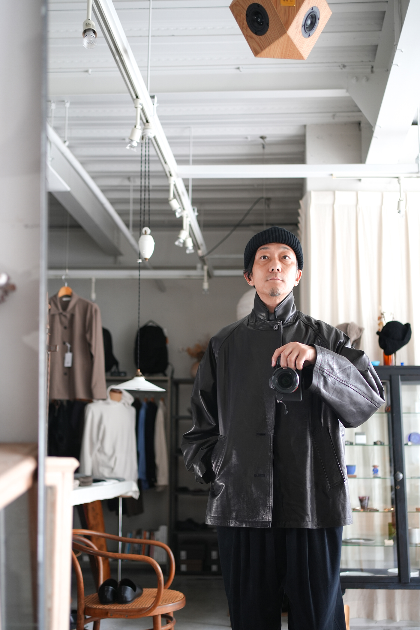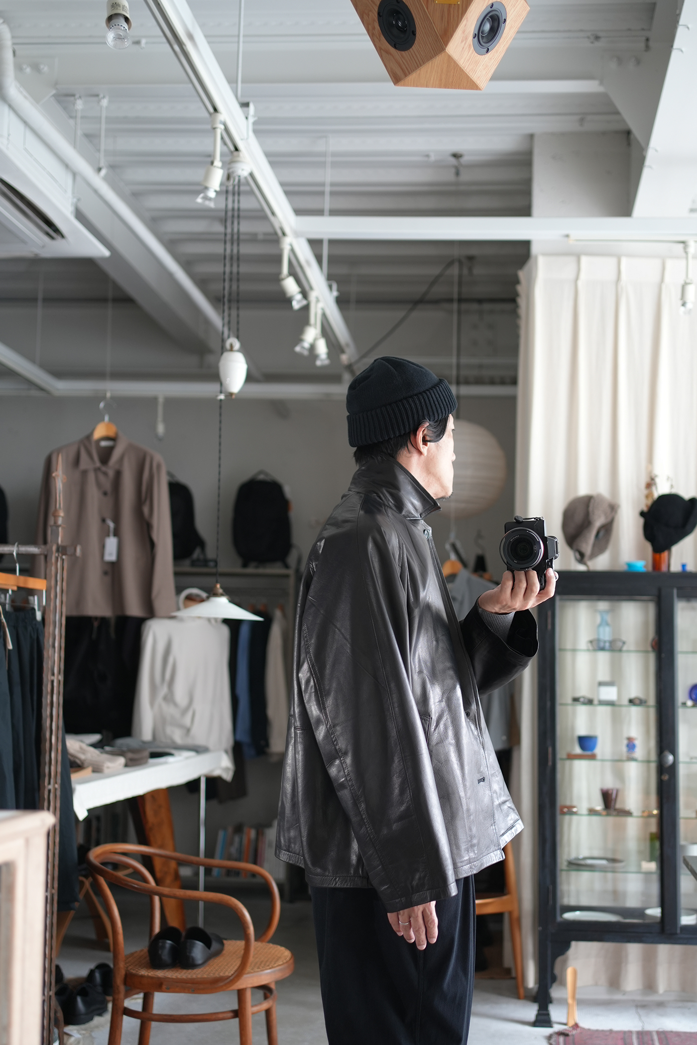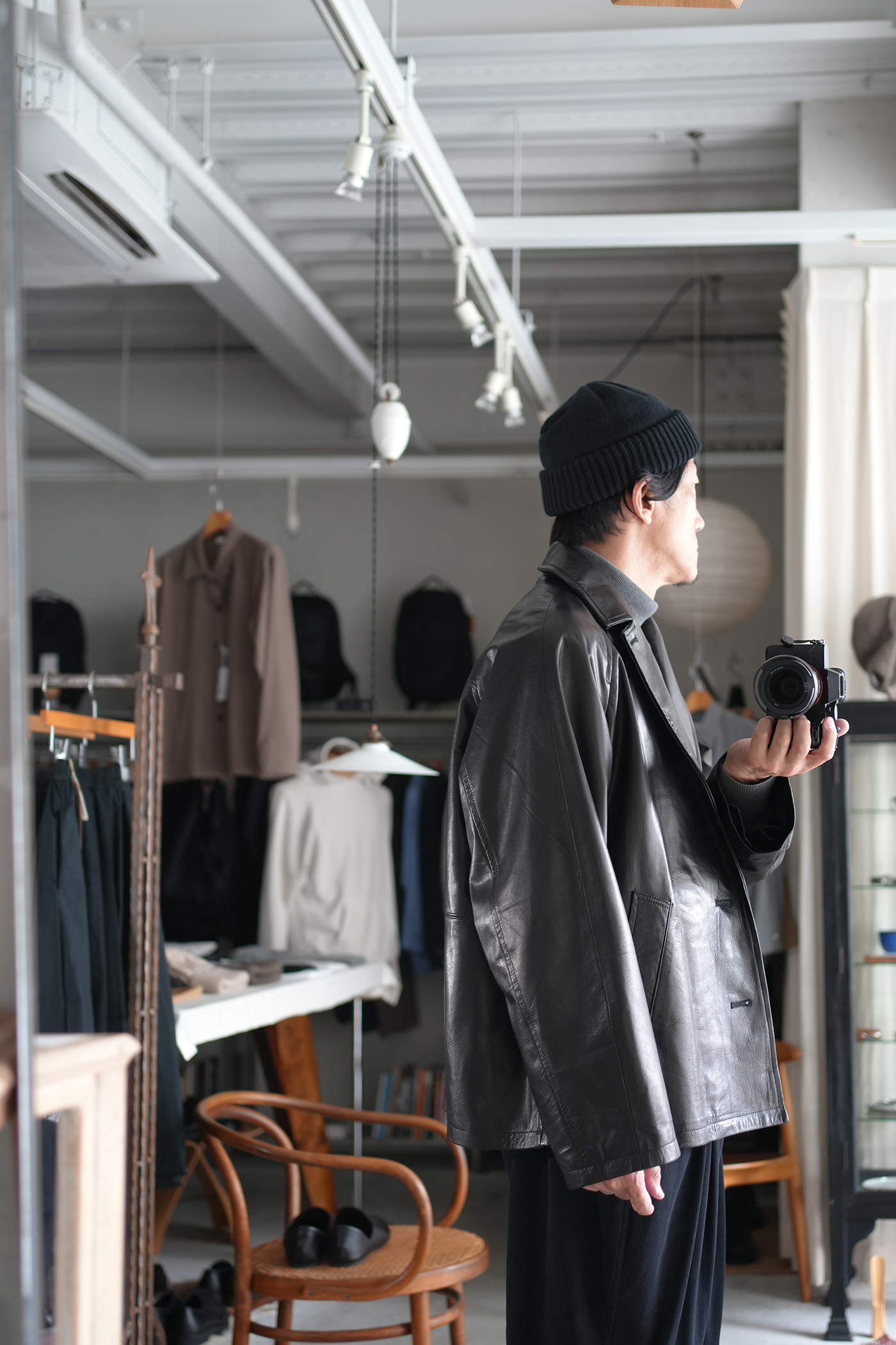 オーバーサイジングで仕上げたシングル2Bレザージャケット。ボックス型シルエット、箱ポケット、ラグランスリーブの形状なそブルゾンの様な着用感。襟先をボタンで留められる事によりコートの様なスタイリングの変化を楽しめる。前見頃はレザーを剥がず1枚もので仕上げている美しく贅沢な仕上げ。驚くほど軽量でしなやかなレザージャケットで軽快にスタイリングいただけます。レザーは日本の老舗タンナーにて製作された極薄のカウレザーを使用、なめしの工程で石灰液につけ革をソフトにし、薄いながらも強度のあるレザー、まるで布帛のようなドレープ感があり、レザーアウターながらストレスのない着心地が素晴らしい一着です。