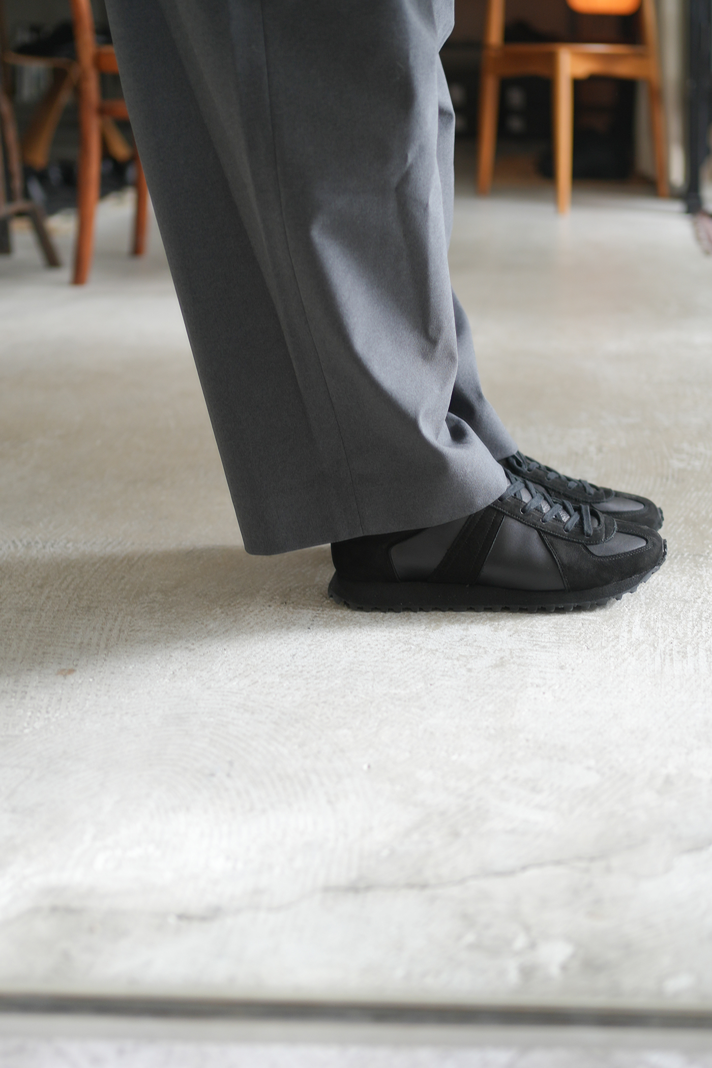 「ALTERUM|オルタム」ブランドは、Alternative(もうひとつの選択)に、Mind(精神)、Maven(専門)、 Military(軍用)などの頭文字”M”を繋いだ造語。普遍的なヴィンテージモデルやアーカイブスペック を踏襲しつつ、より現代的にブラッシュアップさせた価値あるフットウェア創造がコンセプトの新進東京初ブランド。セレクトしたモデルは旧ドイツ軍向けにトレイル用として開発されたプロトタイプジャーマントレーナーを独自の解釈により再構築したリプロダクテッドモデルのエクスクルーシブライン。アーカイブスペックを忠実に再現したラスト(木型)を用い、程よい光沢があり、しっとりとした質感が魅力の国産オイルレザーとキメが細かく滑らかなヌバックレザーをアッパーに採用。また、ライニングとインソールには通気性と耐摩耗性に優れた純国産ナチュラルピッグスキンと吸湿速乾力の高いキャンブレル素材を組み合わせ、インソールのクッションは着地による衝撃を吸収&分散し、耐久性も兼ね備えた中反発弾性ウレタンフォームを採用する事でフィット感や履き心地をアップデート。フレア角を大胆にきかせ、安定感が増した2層構造のEVAミッドソールに優れたグリップ力と耐久性を誇るVibram社製のレトロパターンソールを実装しています。
