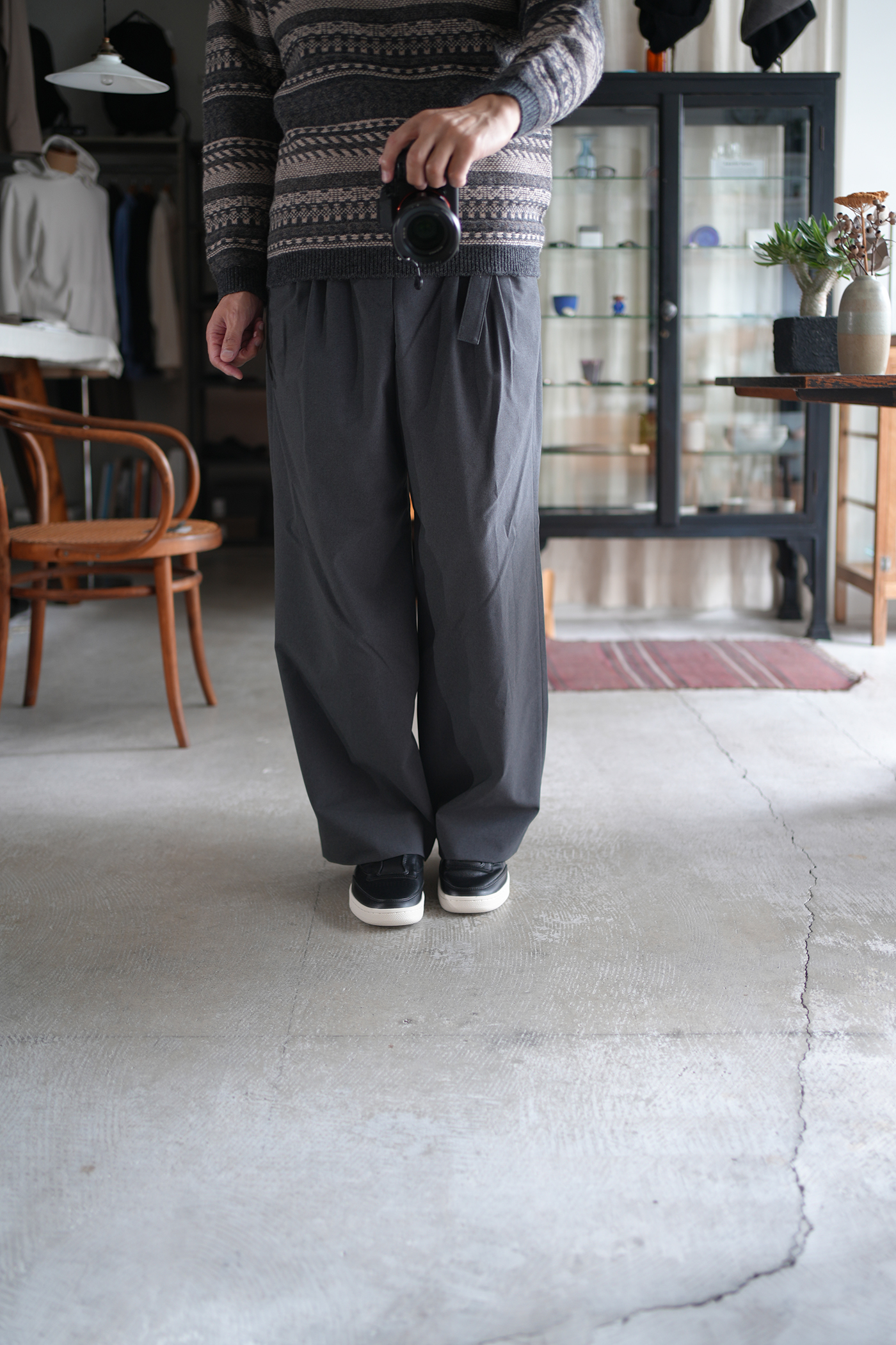 SOLOTEX(化繊生地)を用いた4タックワイドストレートパンツ。綺麗さのあるスラックスデザインであり、ガシガシ穿けご家庭洗濯頂けるイージーケアさが嬉しいパンツです。ウェストはフロントに配されたベルトで調整いただけます。