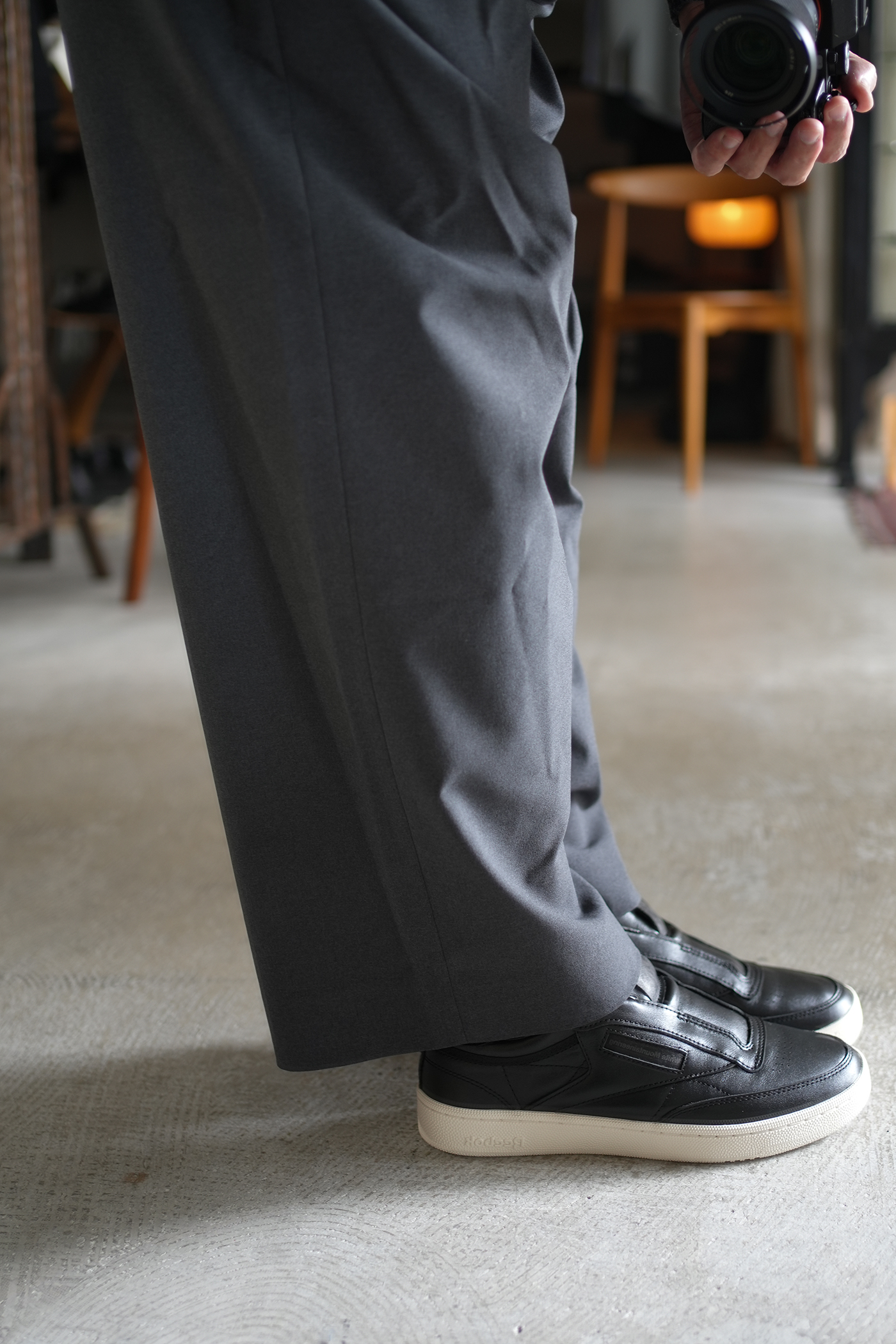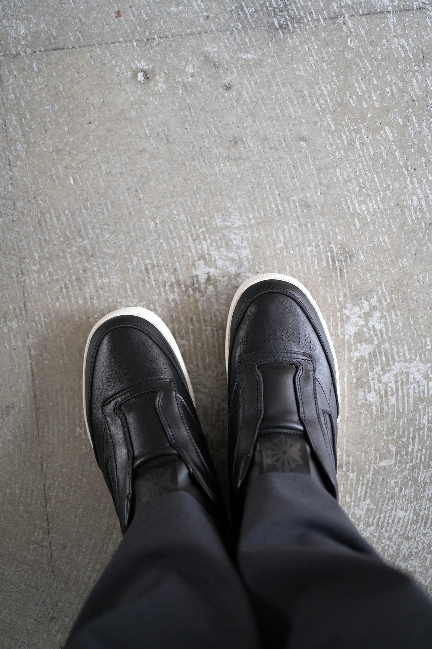 高級感のある上質なカウレザーを採用.。「服を着るフィールドはすべてアウトドア」というコンセプトを掲げ、デザイン、実用性、技術を融合させた独自のスタイルを追求する、”相澤陽介”氏のブランド”WHITE MOUNTAINEERING(ホワイトマウンテニアリング)”。”REEBOK(リーボック)”との第3弾となるコラボレーションでは、生誕40周年を迎える不朽の名作をベースに採用。1985年、テニスシューズ”CLUB CHAMPION(クラブ チャンピオン)”として誕生した、”CLUB C(クラブ C)”。そのシンプルで汎用性の高いデザインは、コートの枠を超え、カジュアルシューズとして絶大な人気を博してきた。今回のコラボレーションでは、そのクラシックなシルエットを、ミニマルなスリッポン仕様へと大胆にアレンジ。アッパーには、艶やかで上質なブラックのカウレザーを贅沢に使用し、ラグジュアリーな雰囲気を創出している。サイドのウィンドウ部分には、”REEBOK”のロゴに代わり”WHITE MOUNTAINEERING”の文字を配置。ソールユニットはクリーンなホワイトで切り替えることで、全体のデザインをシャープに引き締めている。両者の哲学が見事に融合した、洗練された大人のための一足が完成した。着脱の容易さ、フィッティング性、グリップ性能に優れています。アッパーとヒールにそれぞれWMロゴをレイアウトしました。シンプルながらもWMらしさのある、日常使いのしやすい一足です。