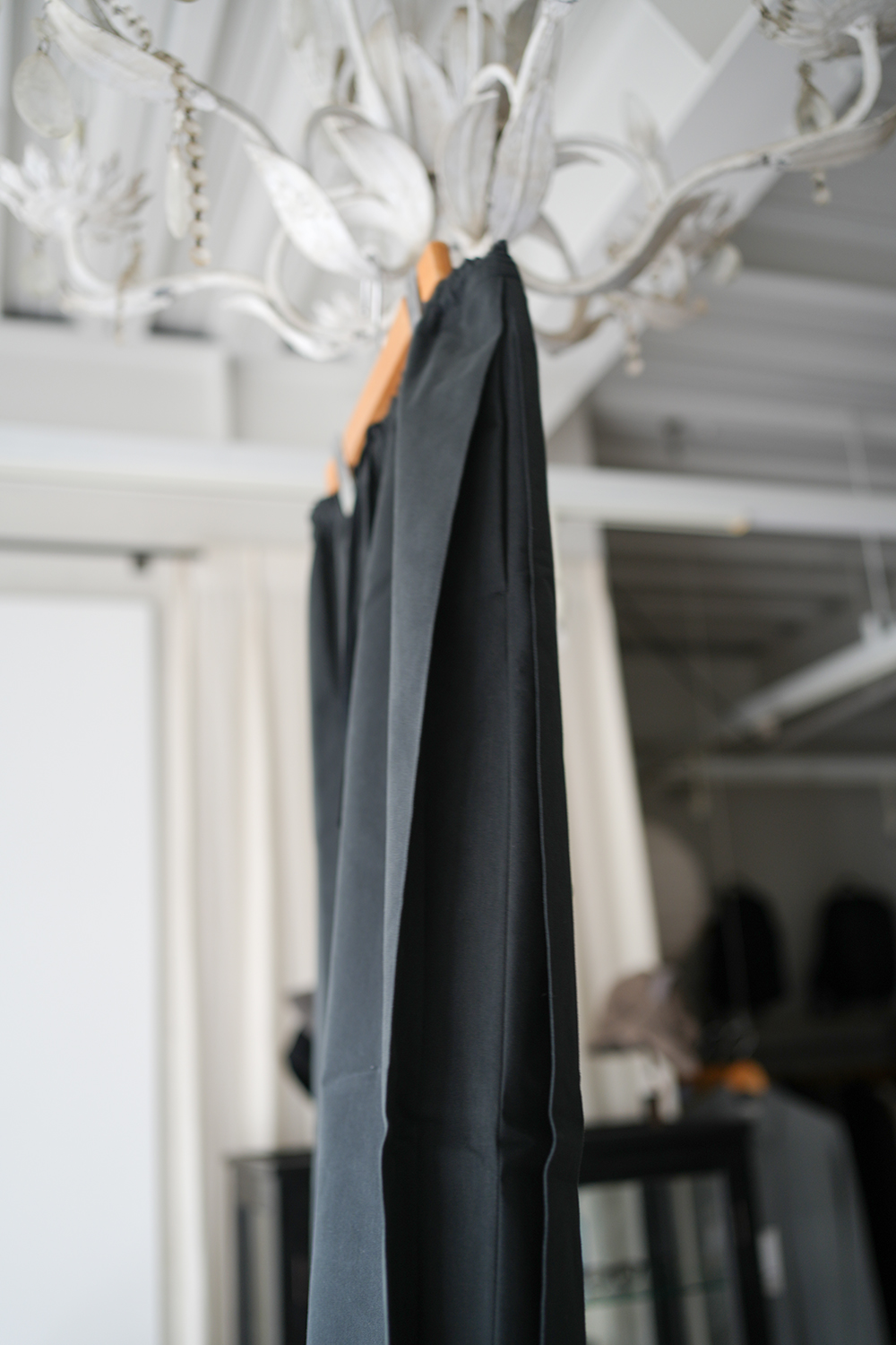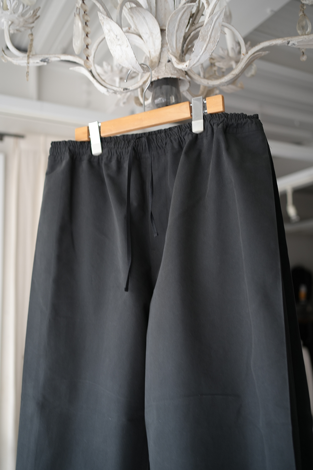 サイドのプリーツデザインが特徴のコンテンポラリーパンツ。今期は、高密度で表面を微起毛させたコットンナイロンで発表。単衣でも風を通しにくく、サイドの大きなプリーツの開閉のメリハリをしっかり演出してくれる。