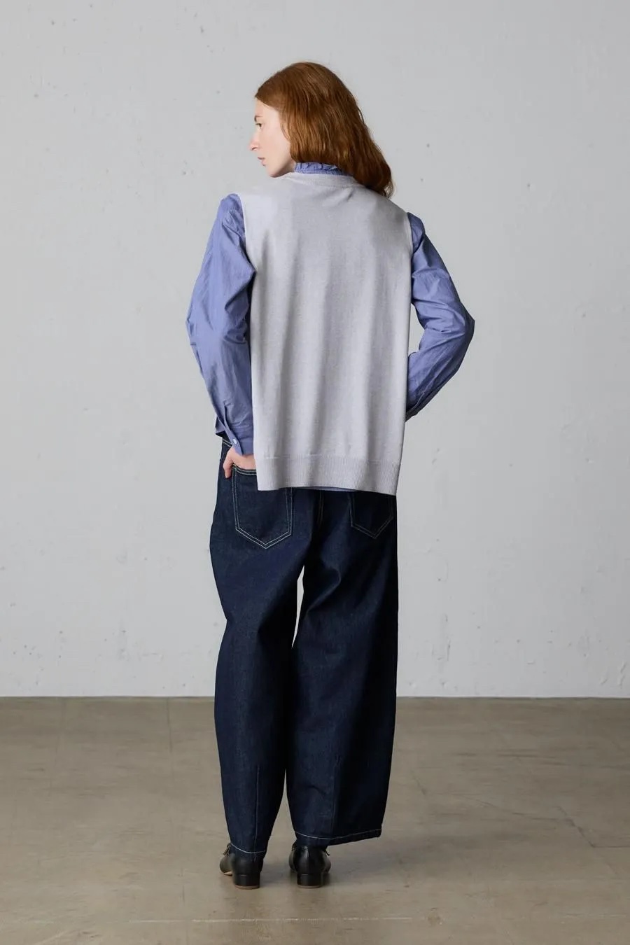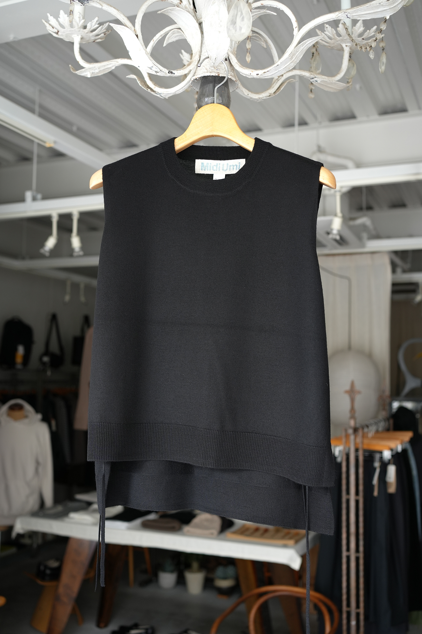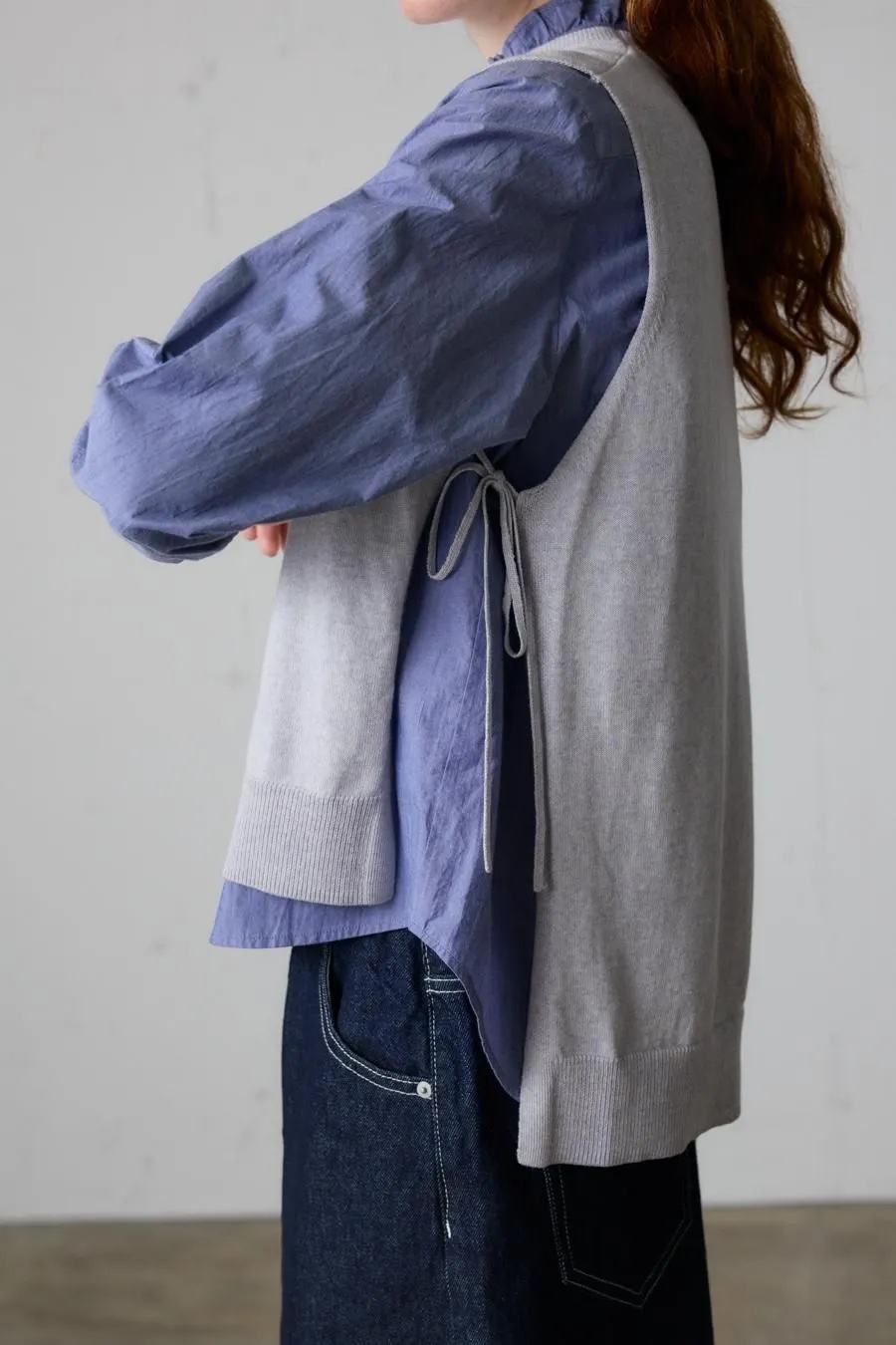 ご自宅でケアが可能なウォッシャブルニットを使用したベスト。ウール素材を使用したハイゲージニットは、薄手でサラッとした肌触り。一見シンプルでベーシックなクルーネックのベストは、サイドのリボンが女性らしいアクセントをプラスします。前と後ろの生地をサイドの紐で結べる仕様になっているので、ボリュームのあるシャツやワンピースにも合わせやすくゆったりと着れるのもポイントです。前後差がありバックが長くヒップにのる丈感。サイドからインナーを見せるデザインがコーディネートをより楽しませてくれます。