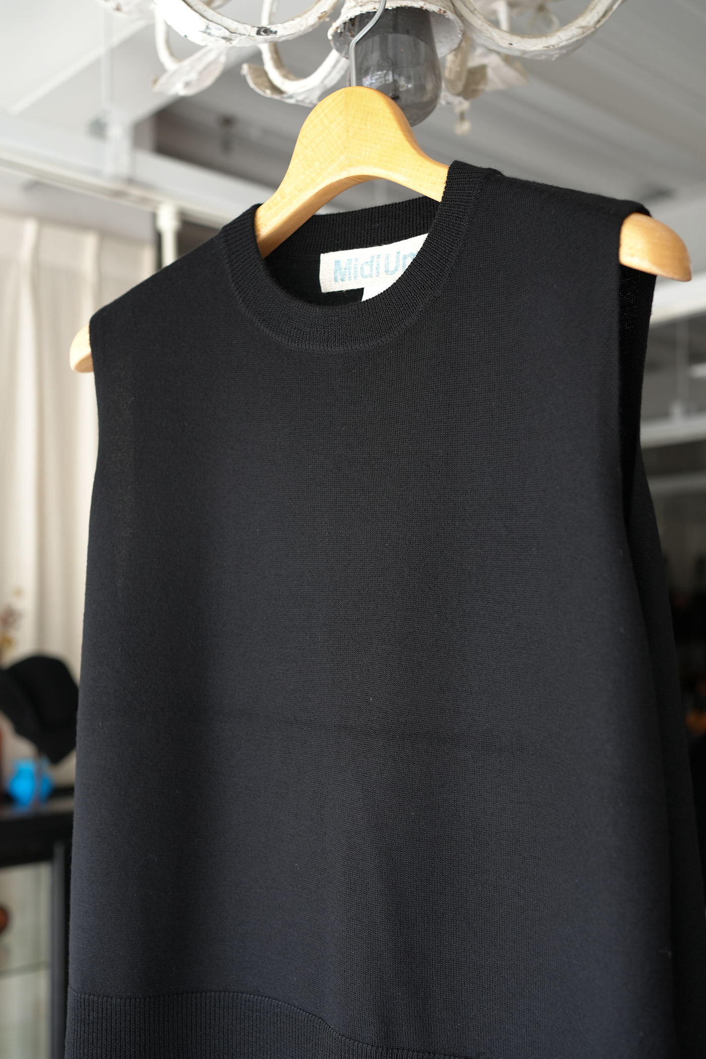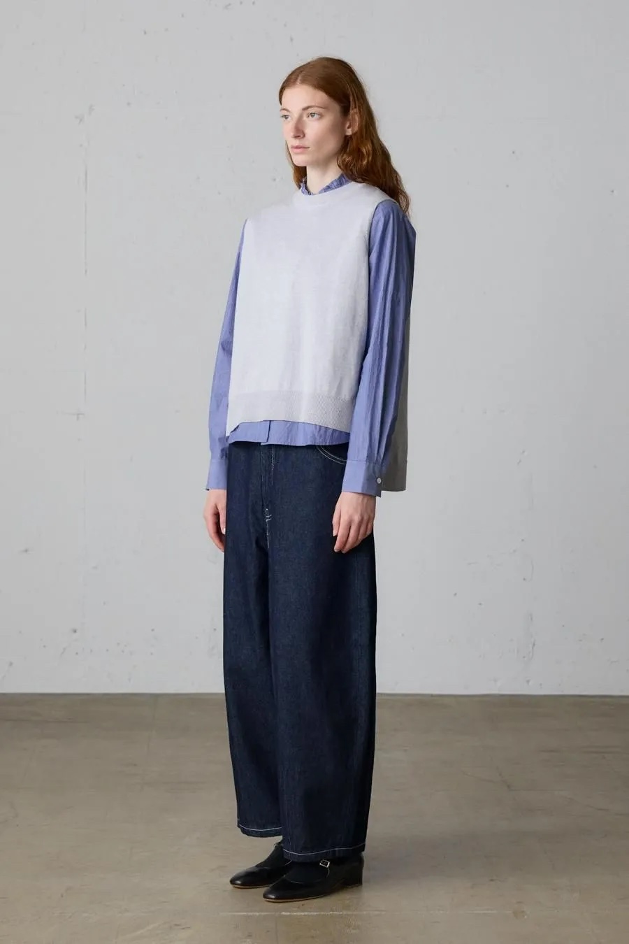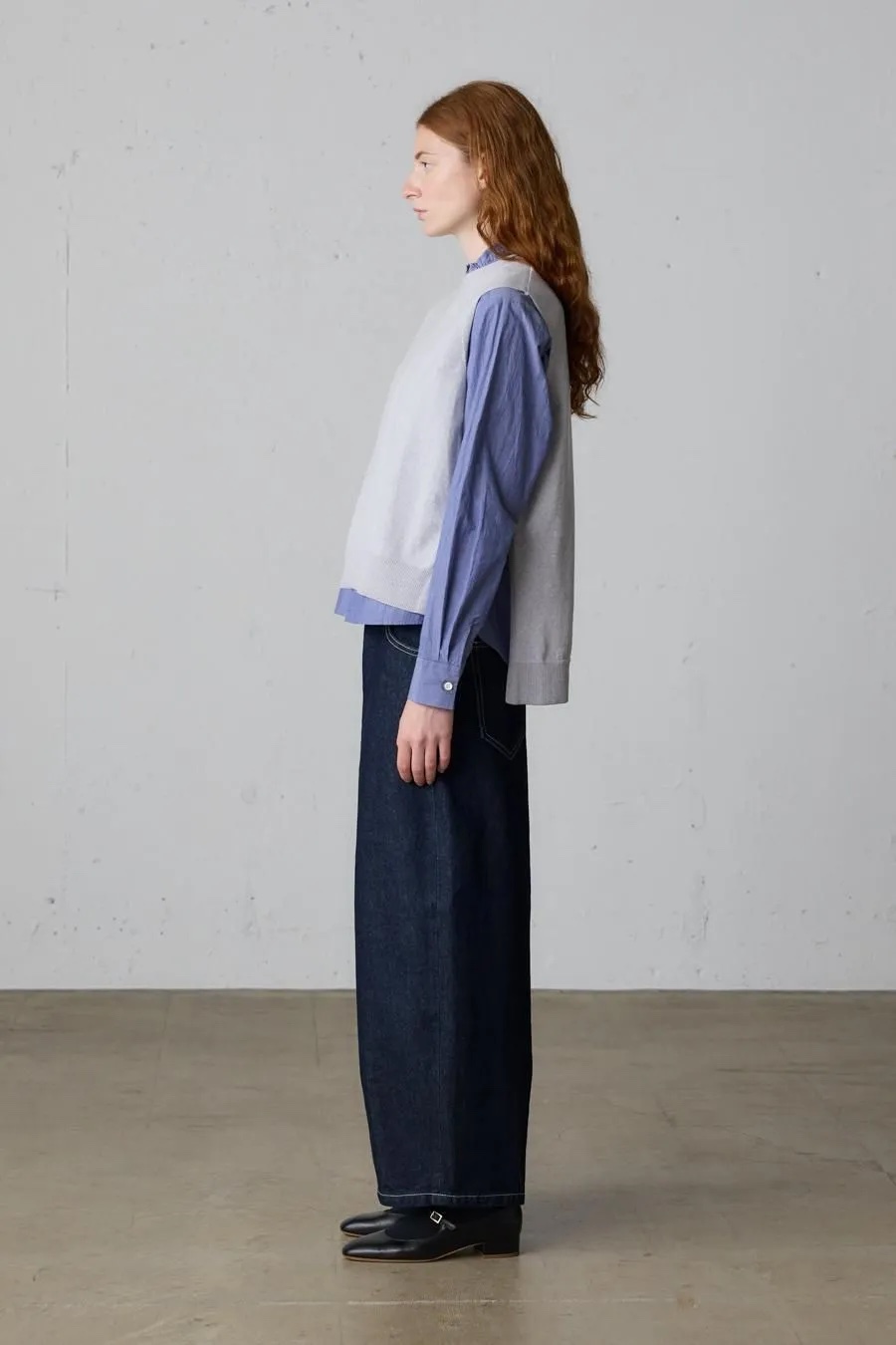 ご自宅でケアが可能なウォッシャブルニットを使用したベスト。ウール素材を使用したハイゲージニットは、薄手でサラッとした肌触り。一見シンプルでベーシックなクルーネックのベストは、サイドのリボンが女性らしいアクセントをプラスします。前と後ろの生地をサイドの紐で結べる仕様になっているので、ボリュームのあるシャツやワンピースにも合わせやすくゆったりと着れるのもポイントです。前後差がありバックが長くヒップにのる丈感。サイドからインナーを見せるデザインがコーディネートをより楽しませてくれます。