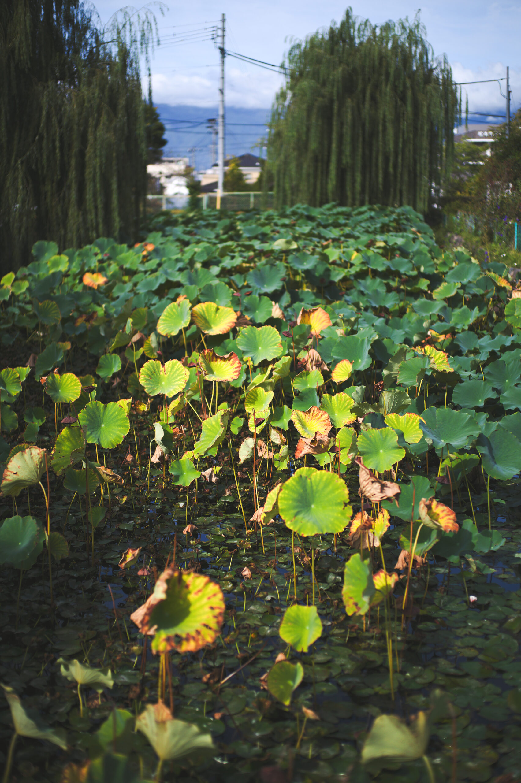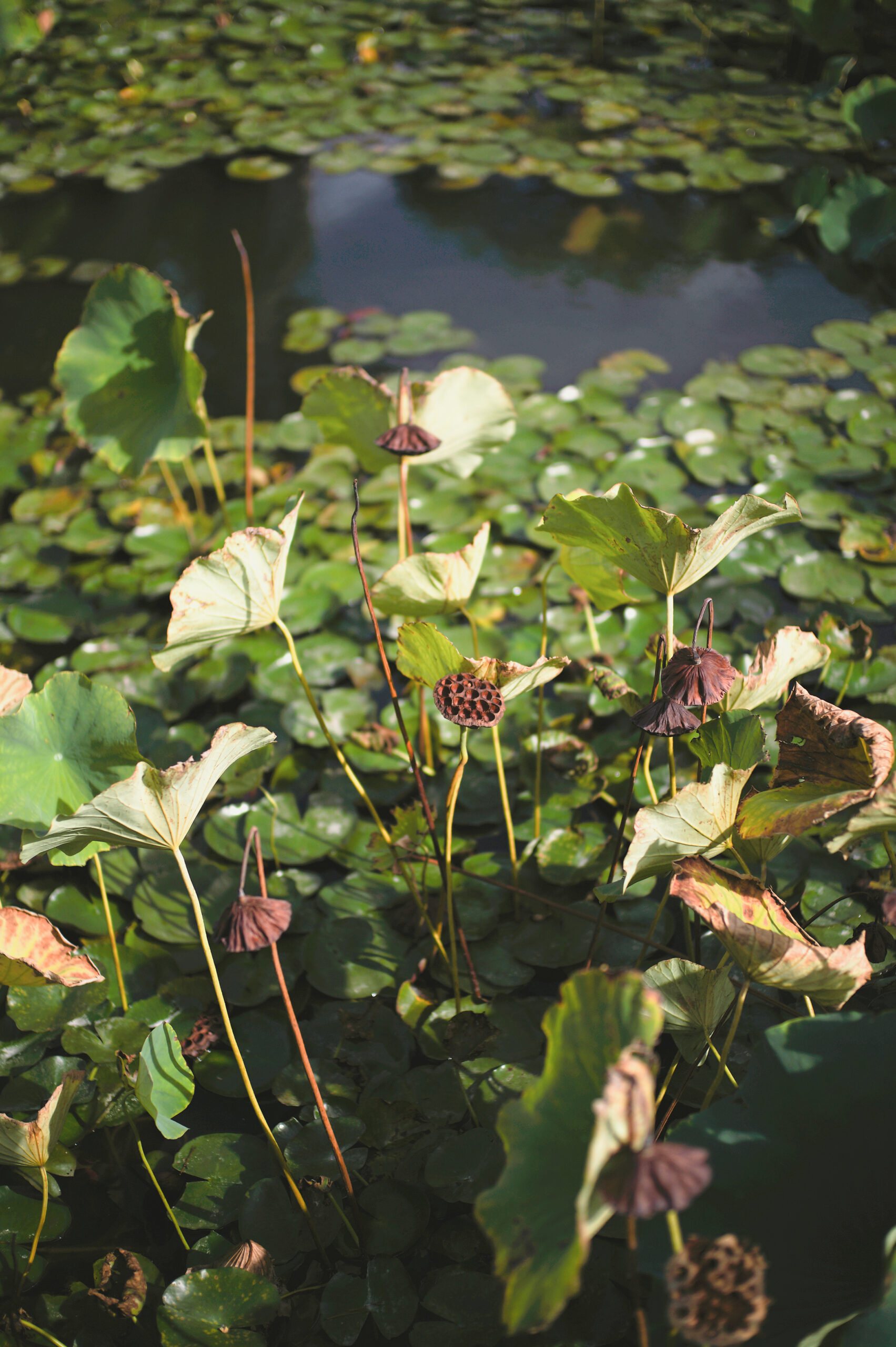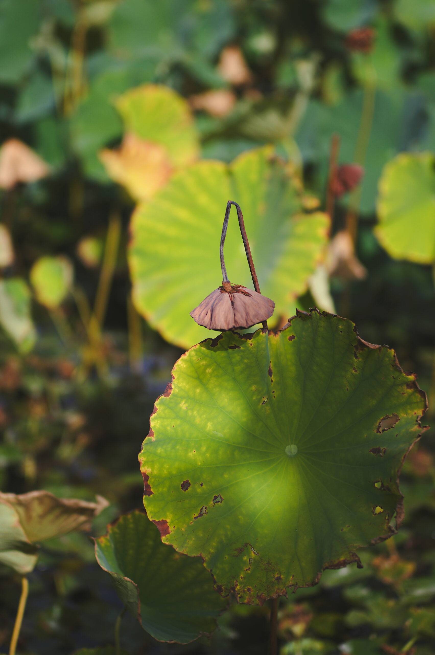 夏が過ぎ、枯れた蓮花と枯れ行く葉、情緒感じる風景を写真に収めた。