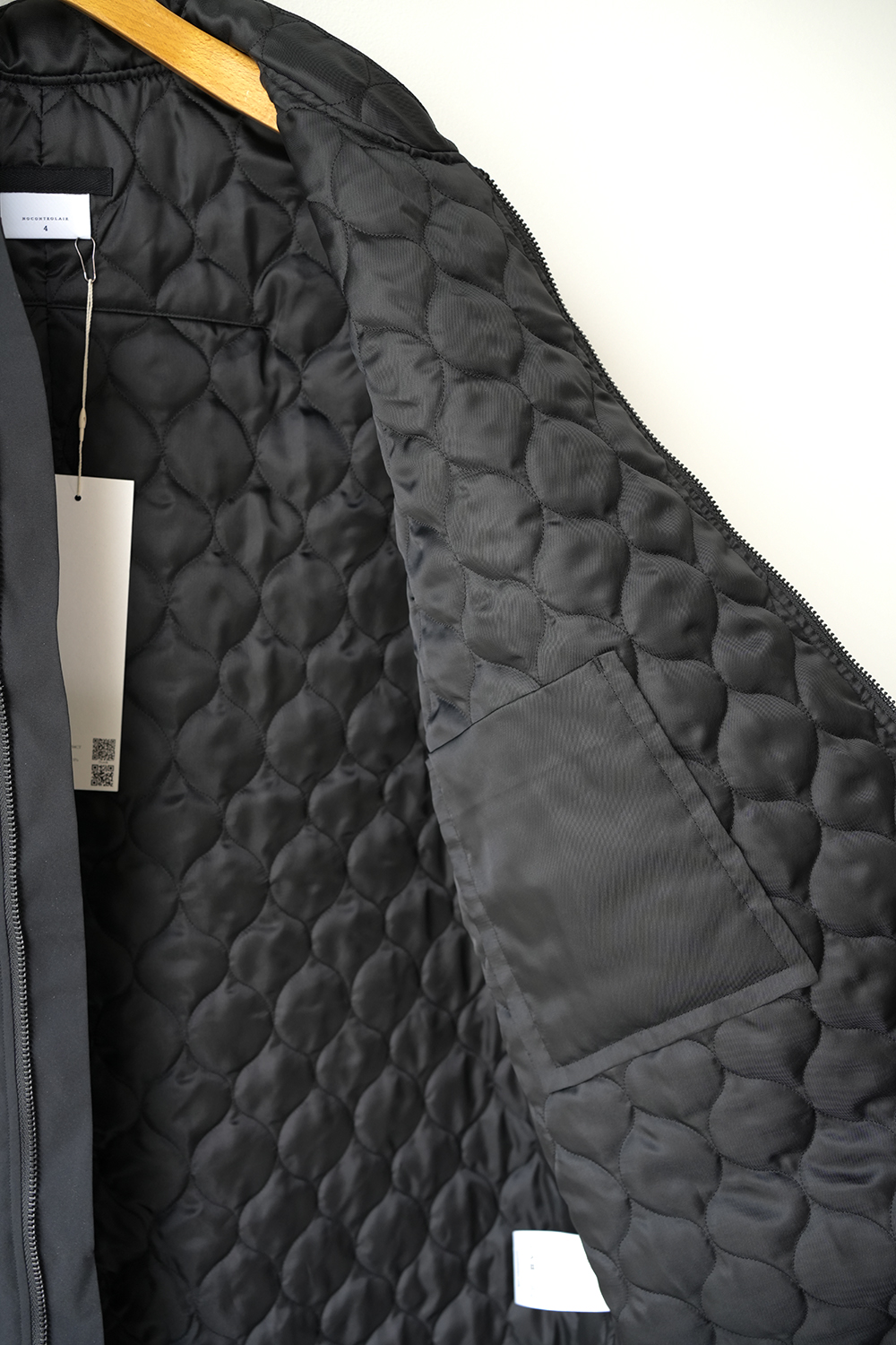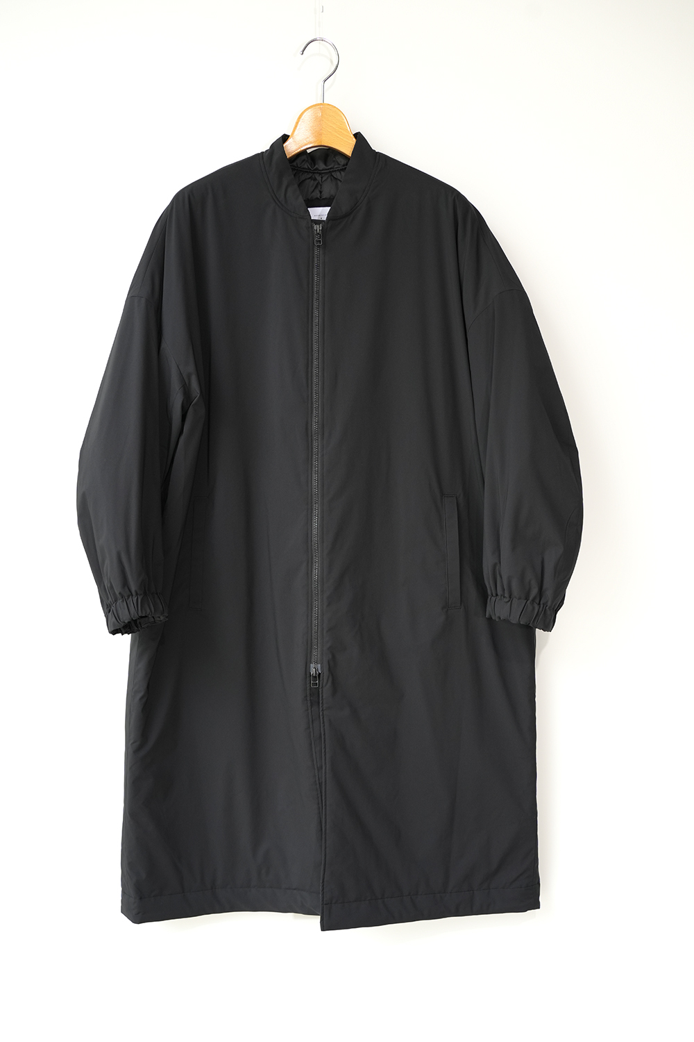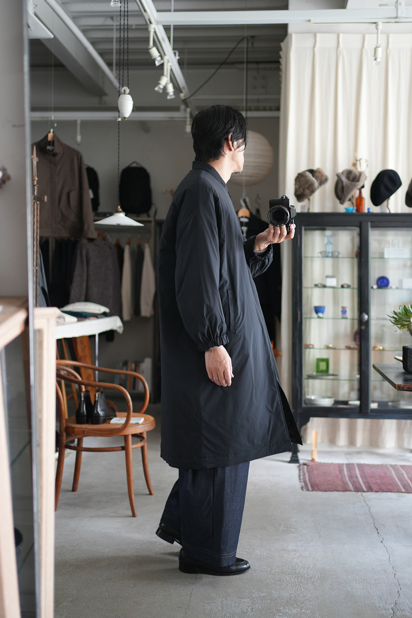 強い撥水性を持ったポリエステル糸を使用したウェザー生地、ストレッチ性があり軽量でとても扱いやすい生地です。中綿は三菱ケミカルのコアブリット。襟を共地にてブルゾンデザインであるリブカラーで仕上げたロングコート、軽くて丈夫、皺になりにくく撥水性があり、暖かい、生地と中綿の特性を活かした気軽にスタリングいただけるロングコートに仕上がっております。