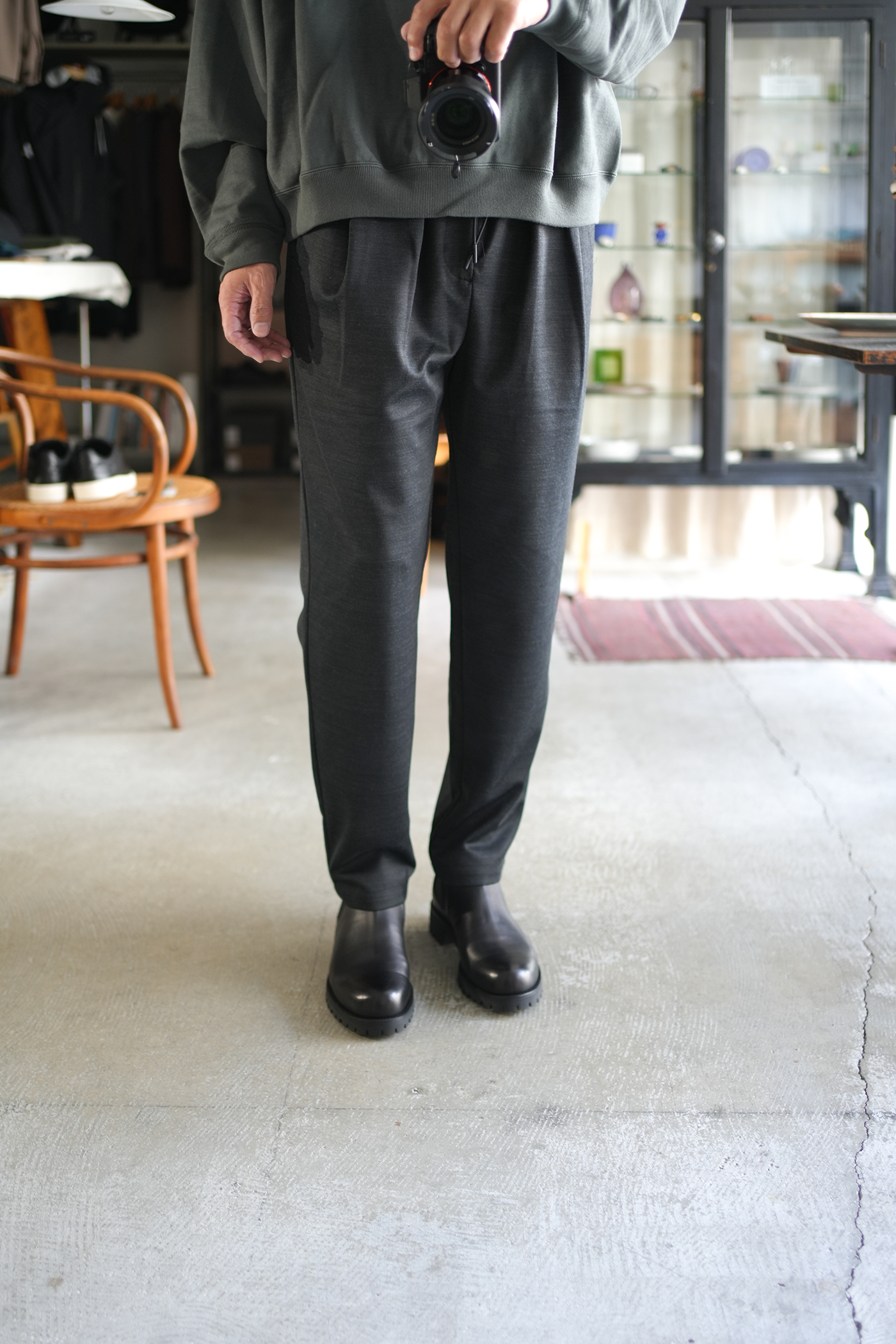 「Repose Wearr」、肩のちからを抜き自由になる。どこにいても、誰といても着る楽しみを忘れない。White Mountaineeringが提案する、リポーズシルエットのアイテム。こちエステルウールのジャージー生地、ややゆとりのあるテーパードシルエットパンツ。